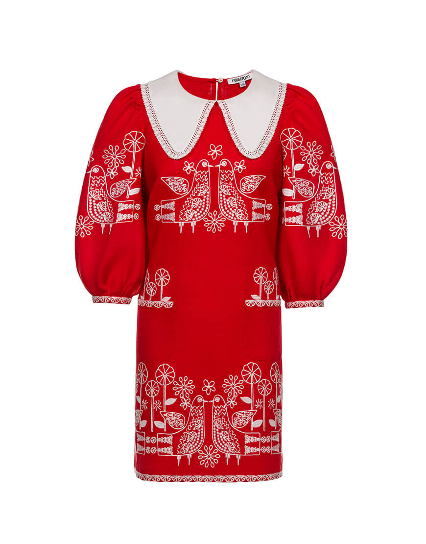 Доставка в течение 3-10 рабочих днейЛляна міні-сукня з вишитими пташками та квітами. Комірець обрамлений мереживом. Стилізовані кармани спереду сукні. Обʼємні рукави 3/4 із зручними застібками на манжетах. Ззаду застібається на ґудзик. Грайливий силует, зручний крій та сучасна вишивка зроблять цю сукню улюбленицею літнього гардеробу.