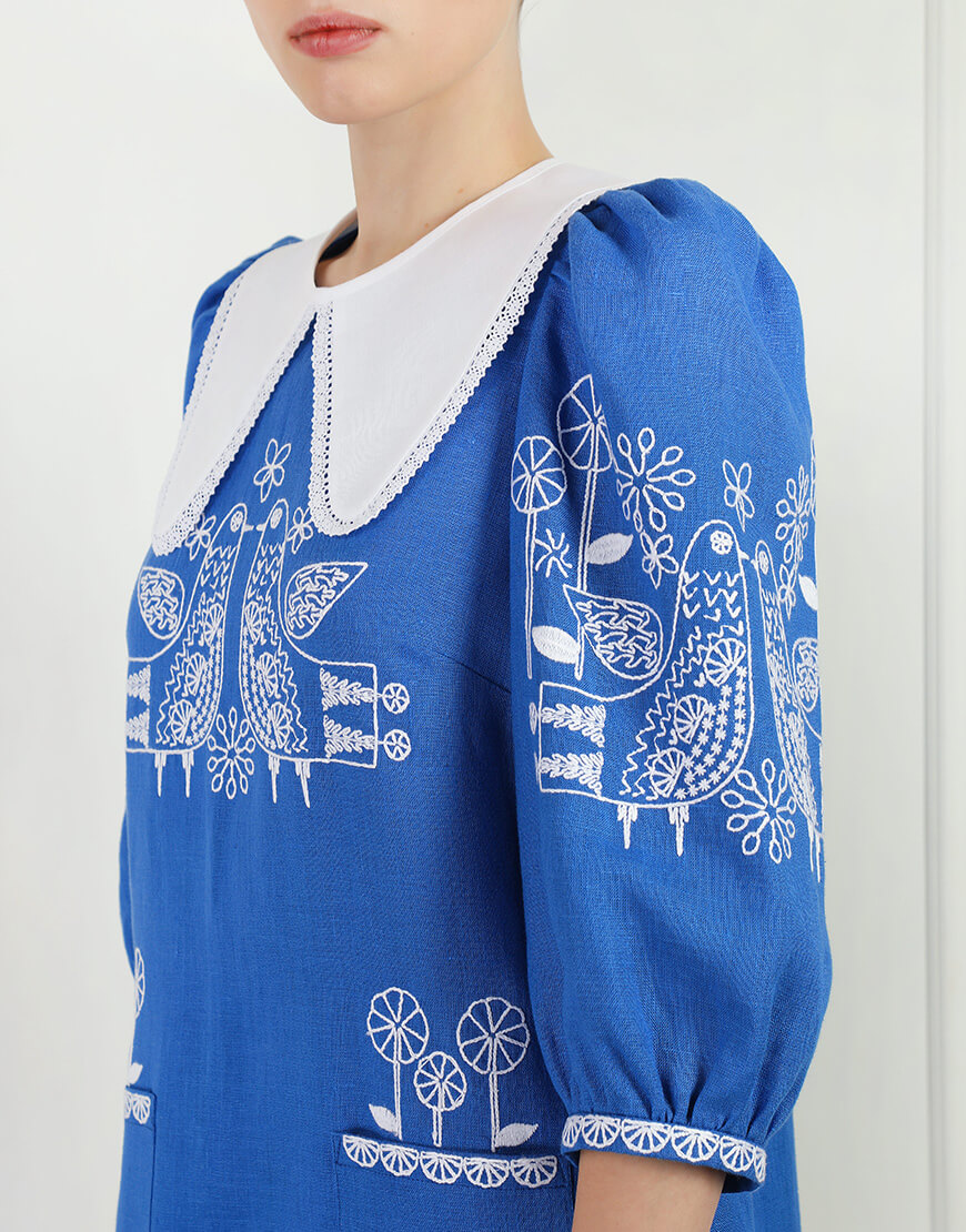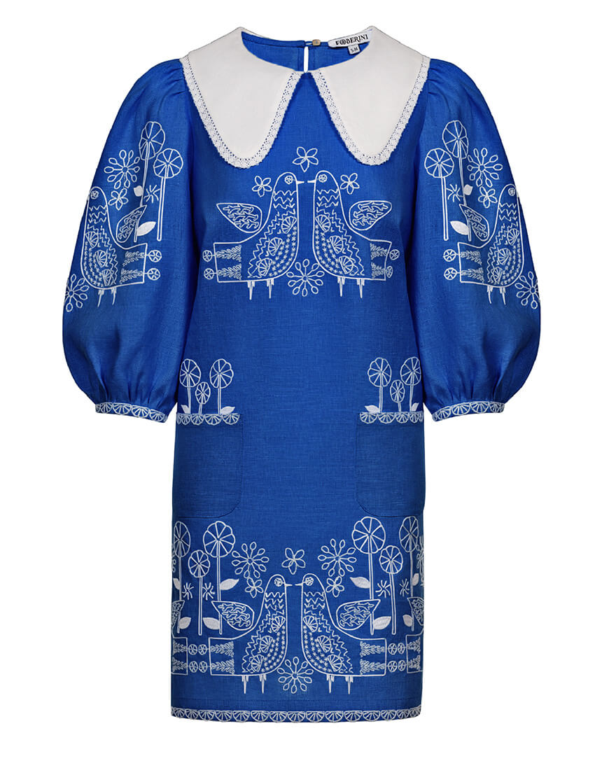 Доставка протягом 2-14 робочих днівЛляна міні-сукня з вишитими пташками та квітами. Комірець обрамлений мереживом. Стилізовані кишені спереду сукні. Обʼємні рукави 3/4 із зручними застібками на манжетах. Ззаду застібається на ґудзик. Грайливий силует, зручний крій та сучасна вишивка зроблять цю сукню улюбленицею літнього гардеробу.
