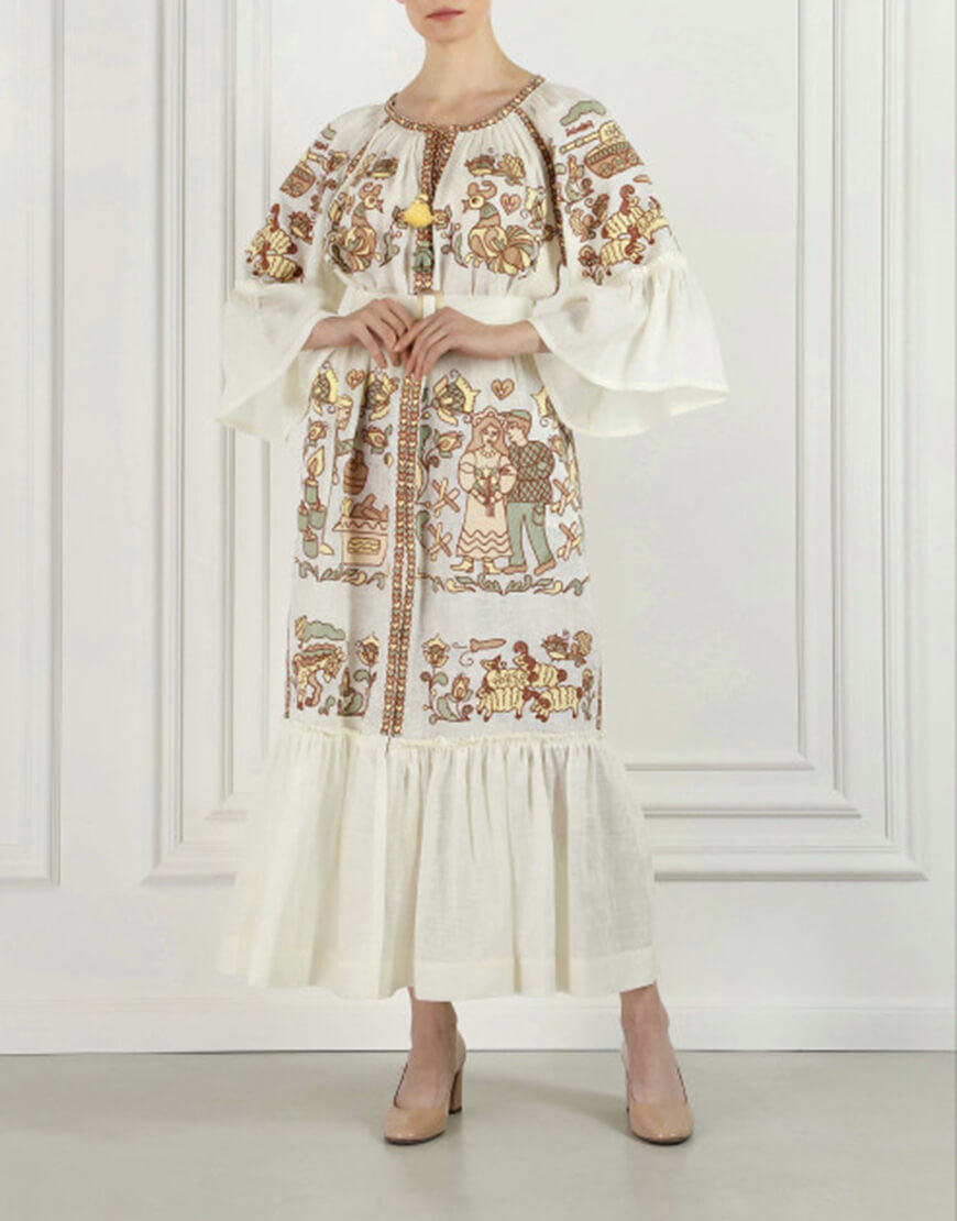 Сукня-максі, натхненна народним гуцульським промислом – косівською мальованою керамікою. Орнаменти в колекції відображають сучасну історію та життя всіх українців. Сукня оздоблена авторською вишивкою, що присвячена волонтерам та закоханій парі.