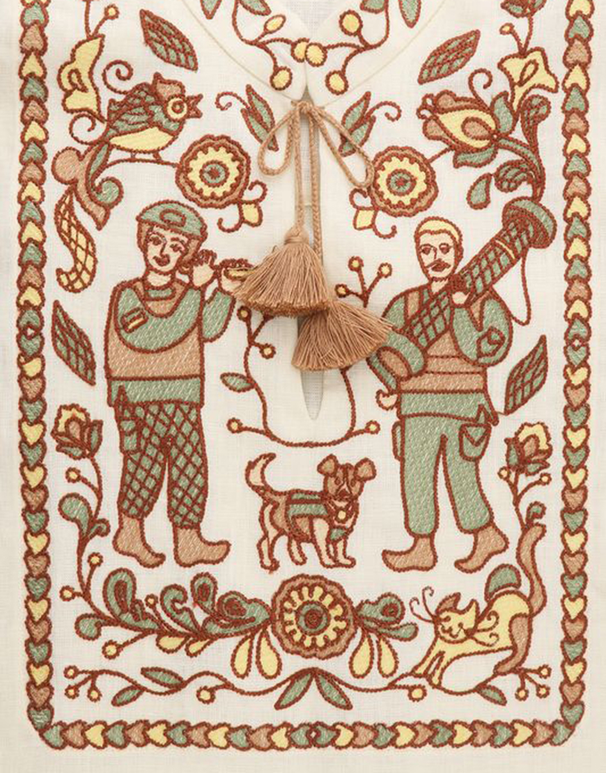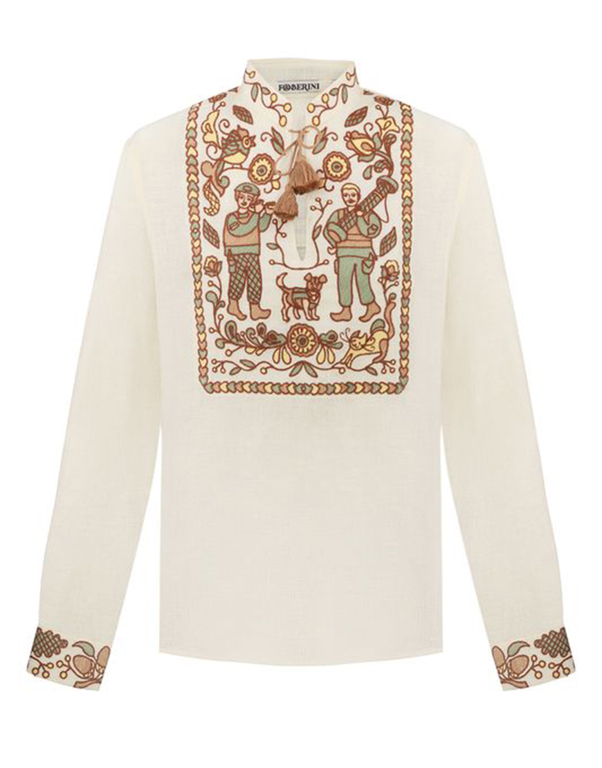 Вишитий комір-стійка та манжети, зав’язки з саморобними китицями та гармонійне поєднання кольорів — зберігаємо сучасну історію за допомогою давніх традицій.