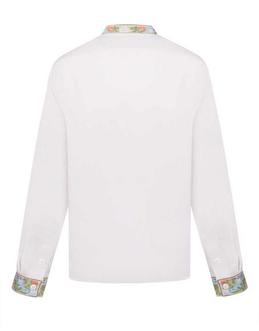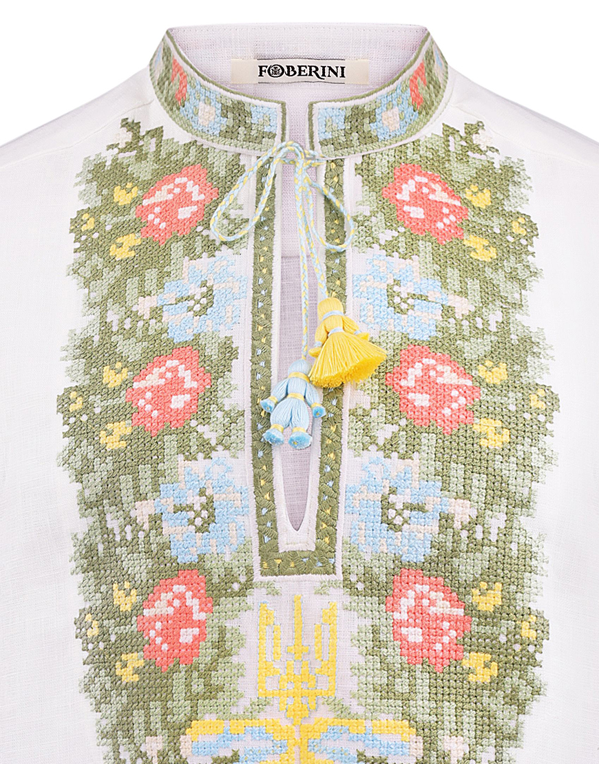 Доставка протягом 3-10 робочих днівСорочка, прикрашена флористичною вишивкою в Борщівському стилі. Горловина виробу оздоблена зав’язками з саморобними китицями синьо-жовтого кольору, а по центру розміщується вишитий український тризуб. Класичний крій, контраст кольорів та вишитий комір-стійка роблять цю сорочку ідеальним варіантом як для урочистих заходів, так і для casual-образів.