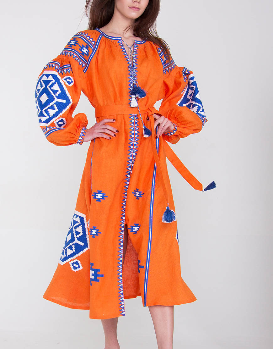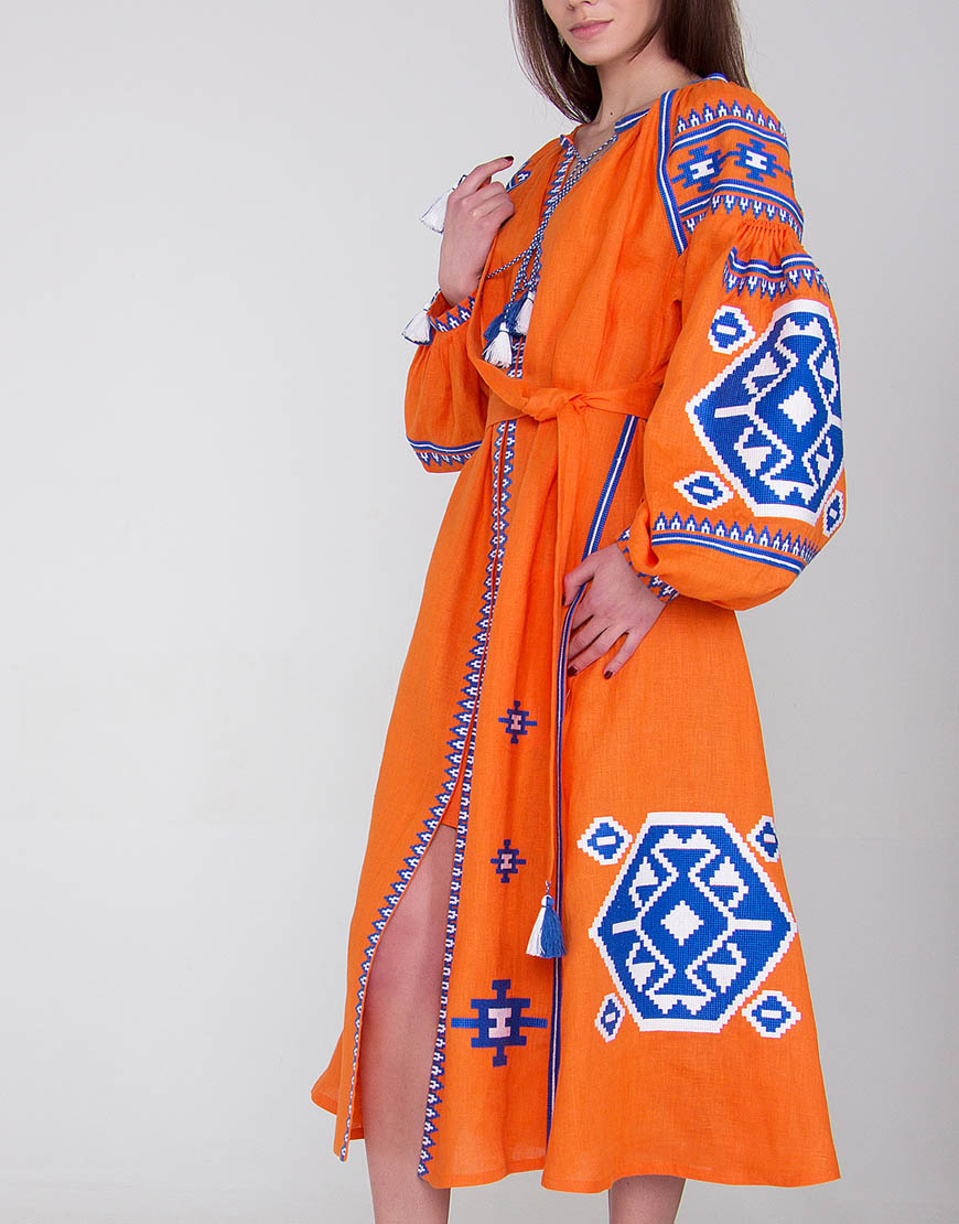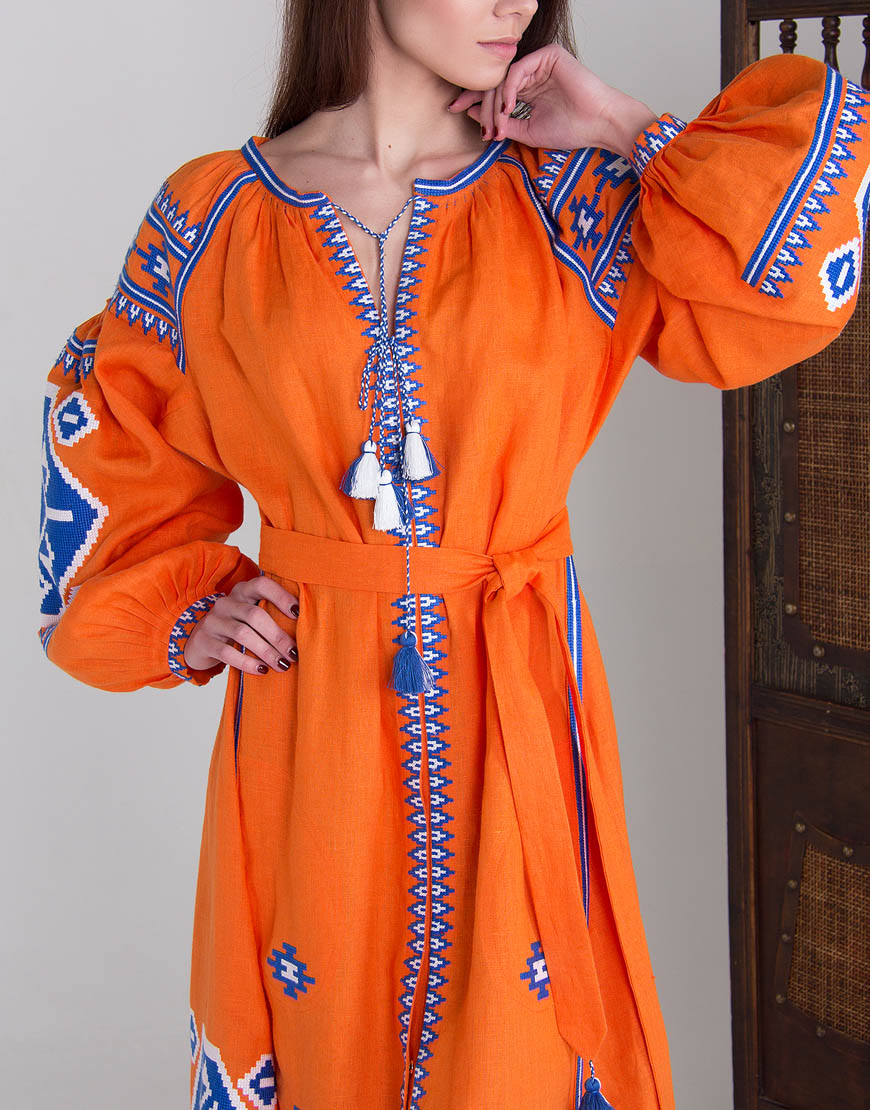 Доставка впродовж 2-14 робочих днівСукня вишиванка гарного помаранчевого кольору з автентичним українським орнаментом, характерним для Закарпаття, пошите з високоякісного льону. Вишивка виконана бавовняними нитками синього та білого кольору (білий – джерело чистоти, непорочності, святості; синій – символ очищення, душевного спокою). Стилізована сукня вишиванка має застібки-кнопки по всій довжині виробу. Використано старовинні українські техніки виконання швів «пухлики» на рукавах та «збирання» на горловині. Помаранчевий колір означає активність і добре розвинений творчий початок, що підкреслює такі якості, як життєрадісність, чуттєвість, а також відкритість і товариськість.