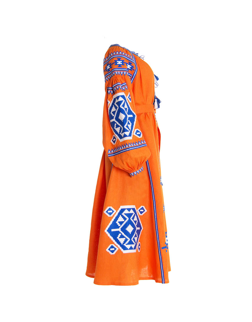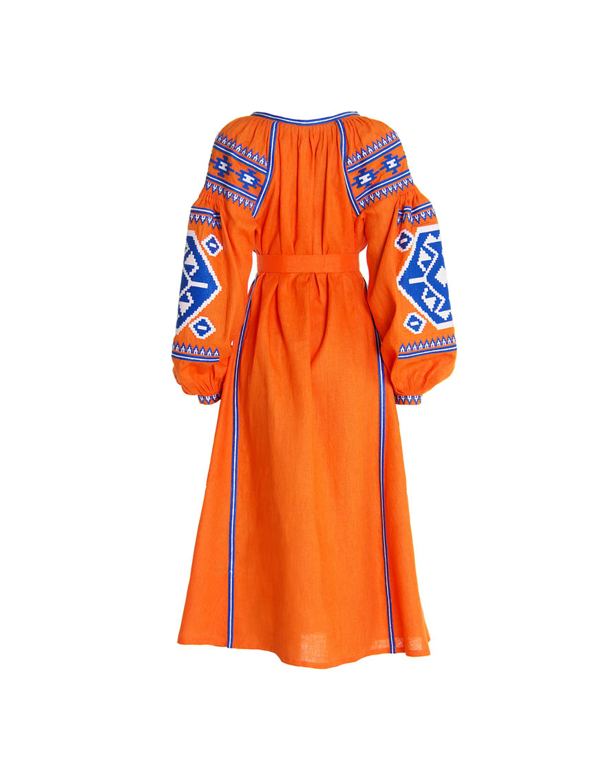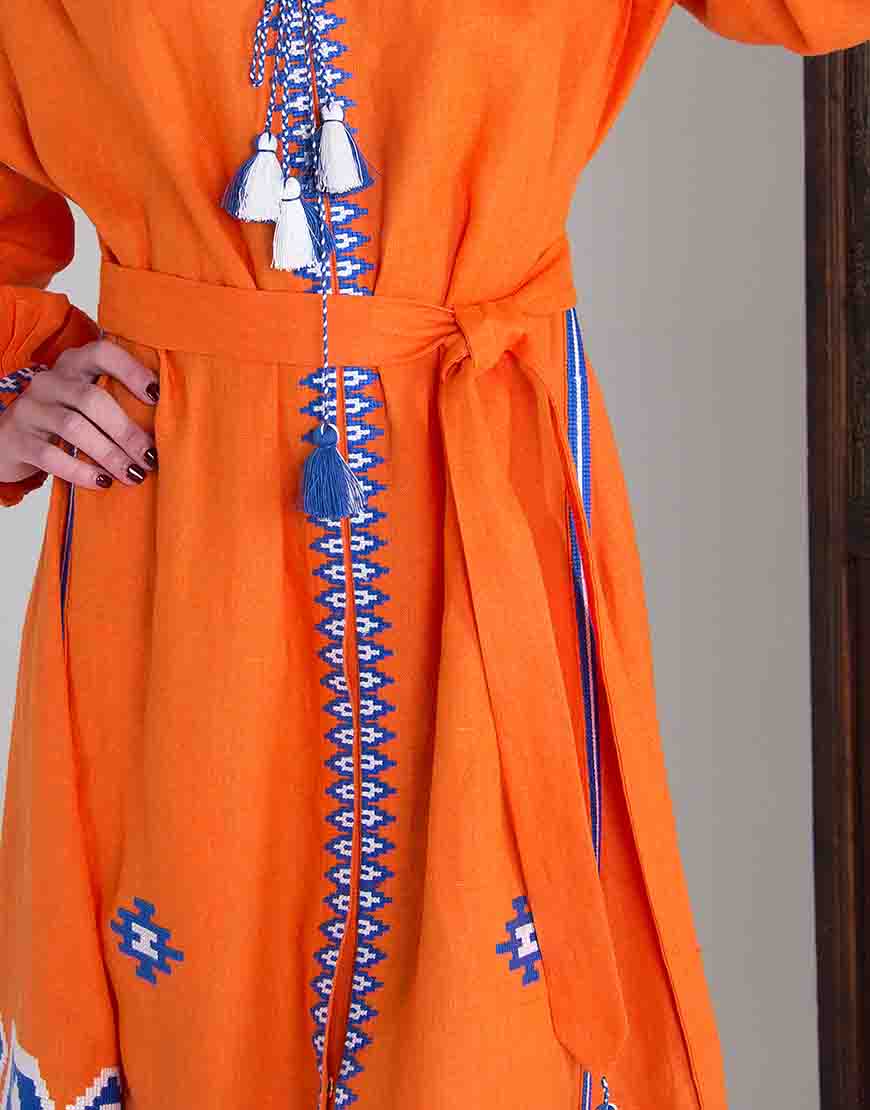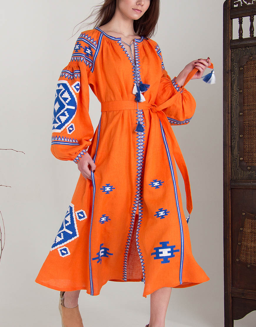 Доставка впродовж 2-14 робочих днівСукня вишиванка гарного помаранчевого кольору з автентичним українським орнаментом, характерним для Закарпаття, пошите з високоякісного льону. Вишивка виконана бавовняними нитками синього та білого кольору (білий – джерело чистоти, непорочності, святості; синій – символ очищення, душевного спокою). Стилізована сукня вишиванка має застібки-кнопки по всій довжині виробу. Використано старовинні українські техніки виконання швів «пухлики» на рукавах та «збирання» на горловині. Помаранчевий колір означає активність і добре розвинений творчий початок, що підкреслює такі якості, як життєрадісність, чуттєвість, а також відкритість і товариськість.