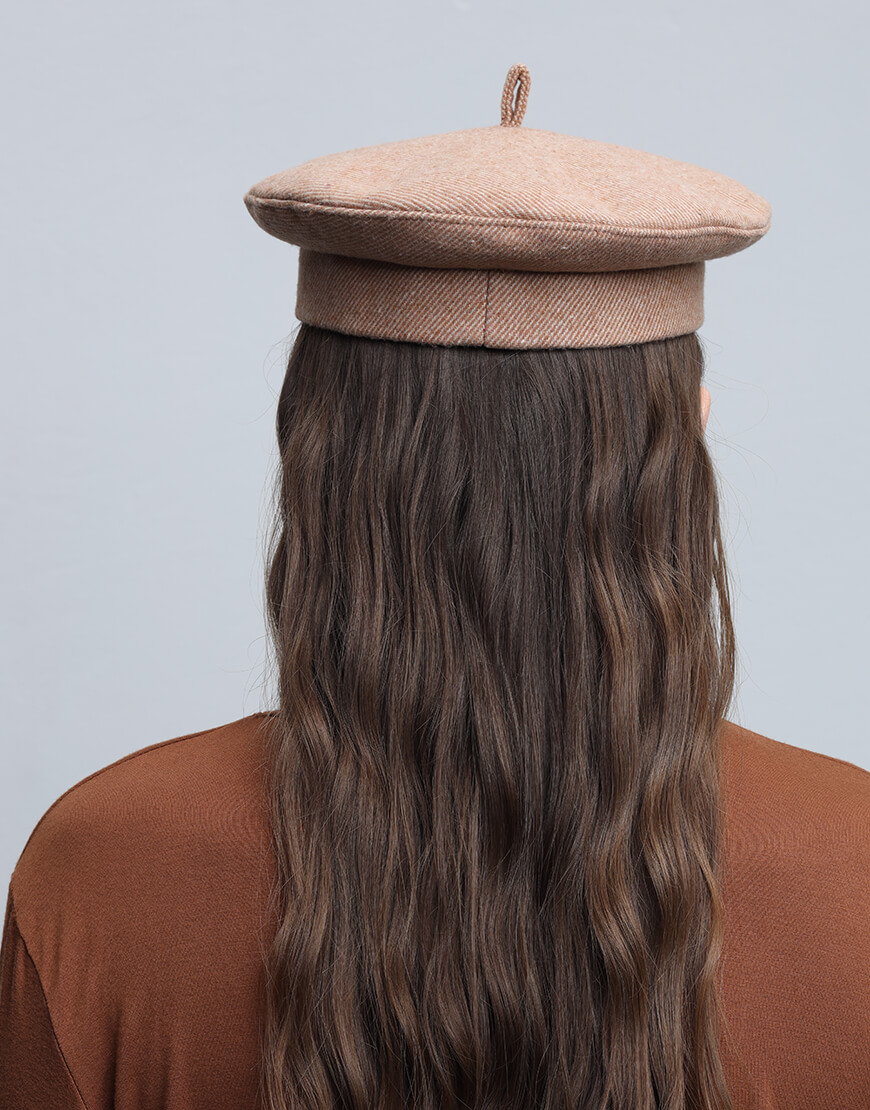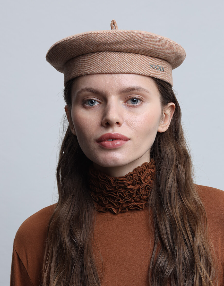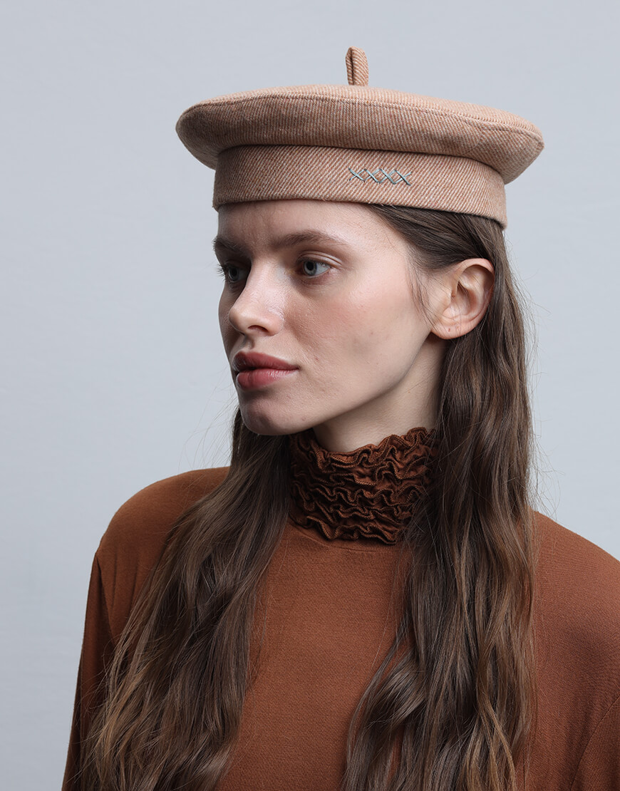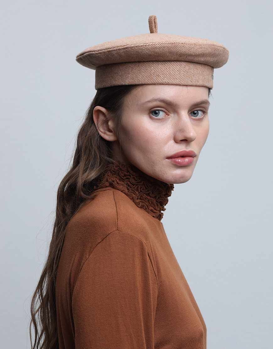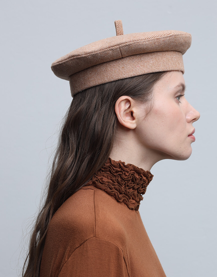 Доставка протягом 3-6 робочих днівБерет із кашеміру карамельного кольору в дрібну полоску