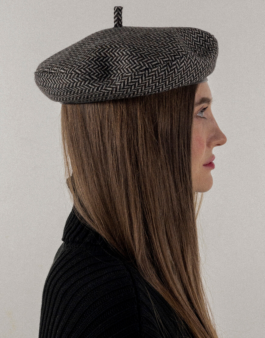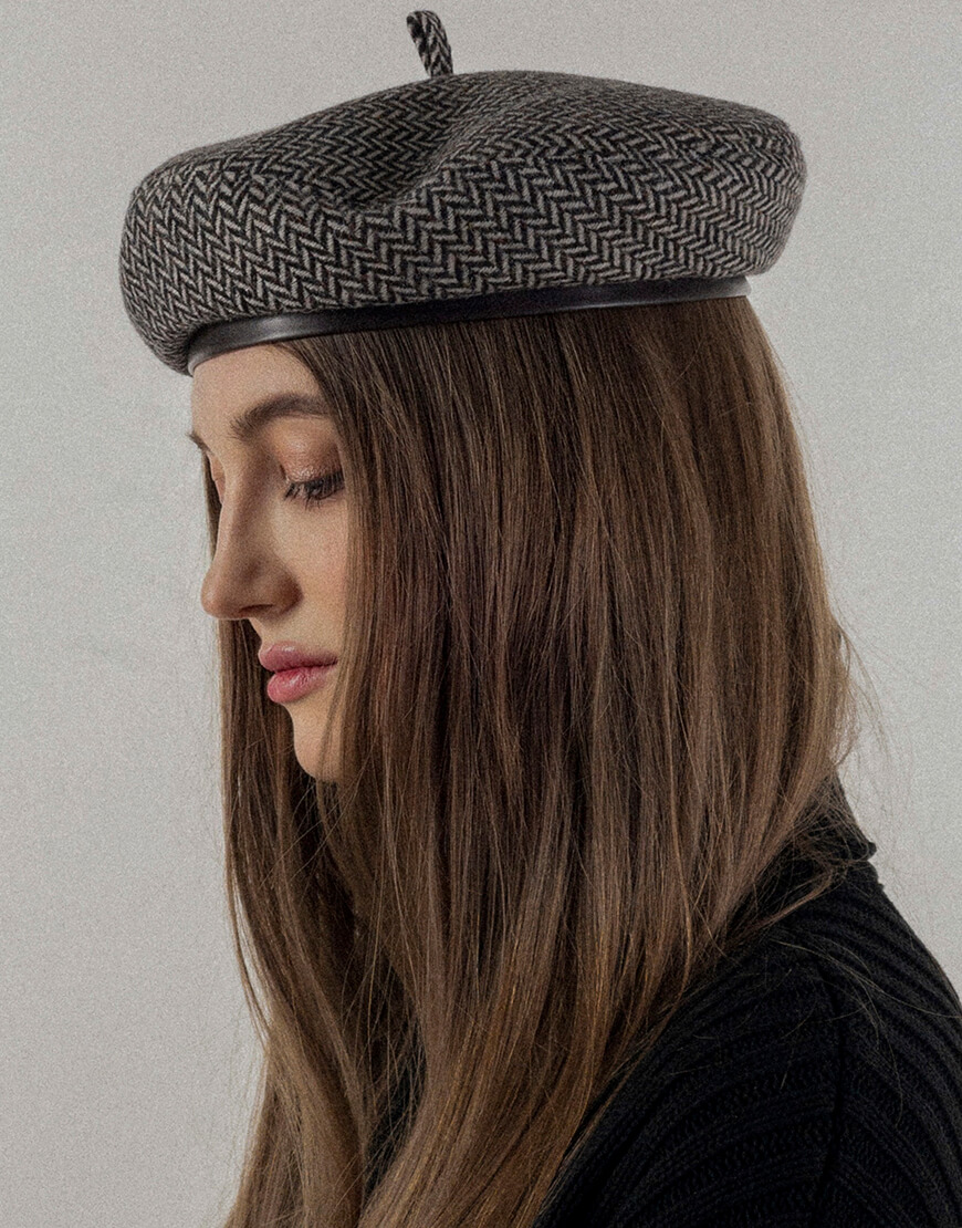Класичний сірий берет в клітинку, з елементами еко-шкіри.