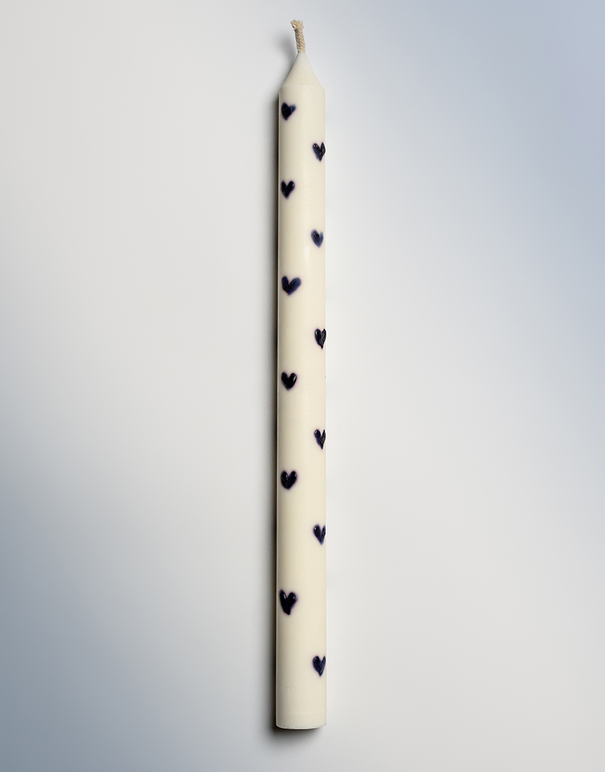 ДоставкаСвічка у молочному кольорі з чорними сердечками — це поєднання елегантності та романтики.