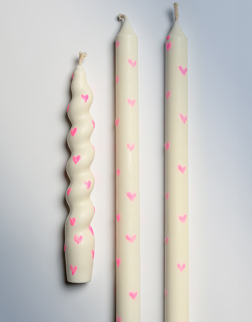 ДоставкаНабір із трьох свічок у молочному кольорі з рожевими сердечками — це поєднання елегантності та романтики. Класичні дві прямі та спіральної форми, розписані вручну, створюють особливу атмосферу затишку й любові у вашому просторі.