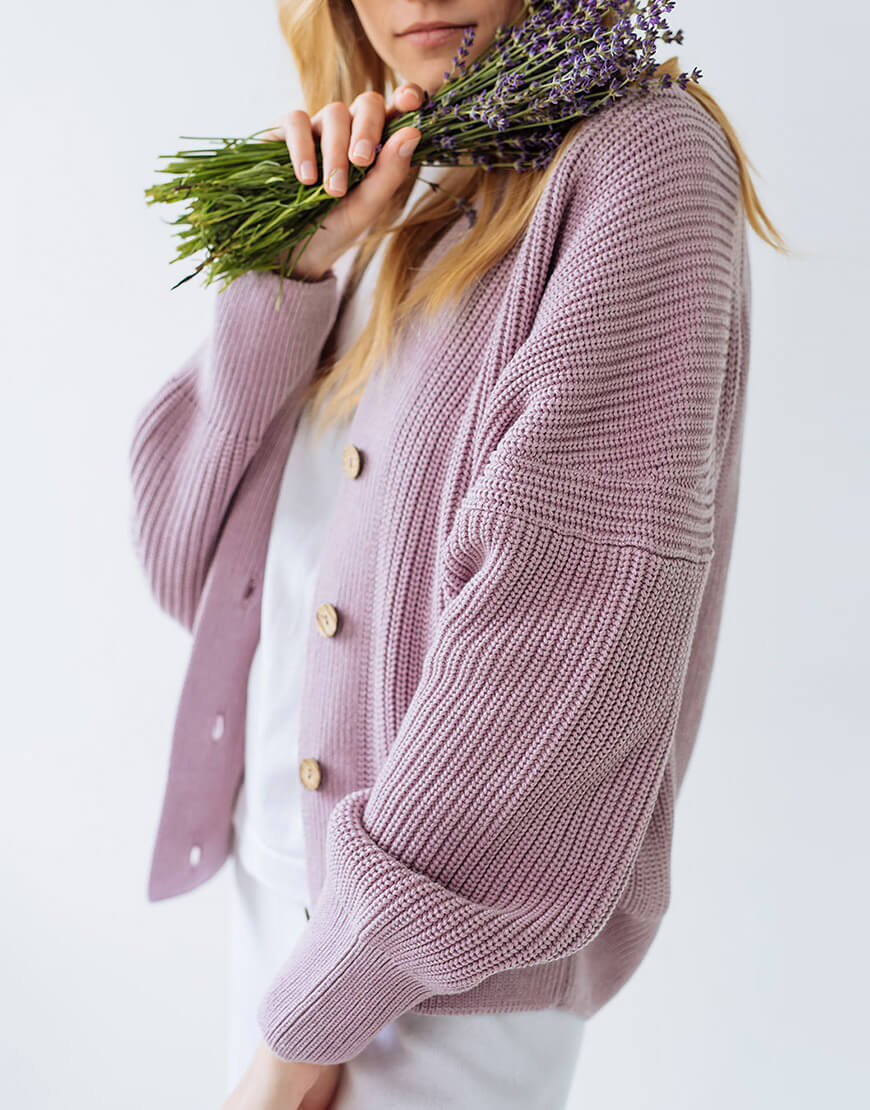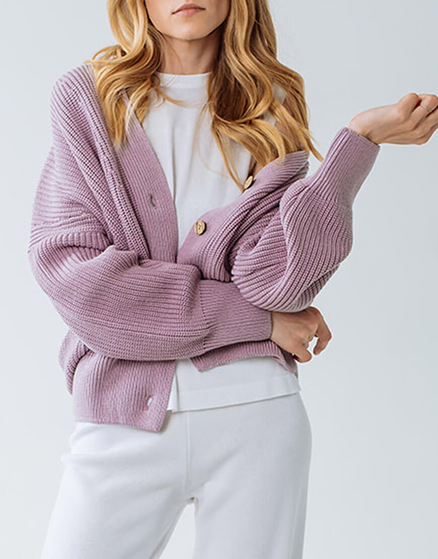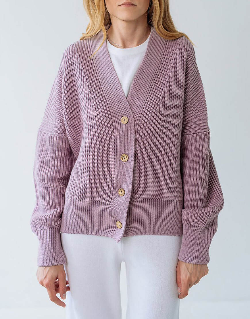 Затишний кардиган на ґудзиках контрастного кольору з бавовни. V-подібний виріз, подовжені рукави.