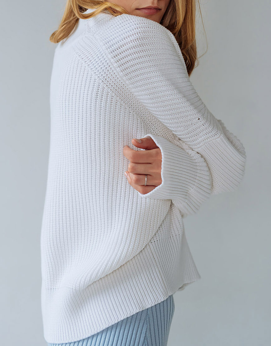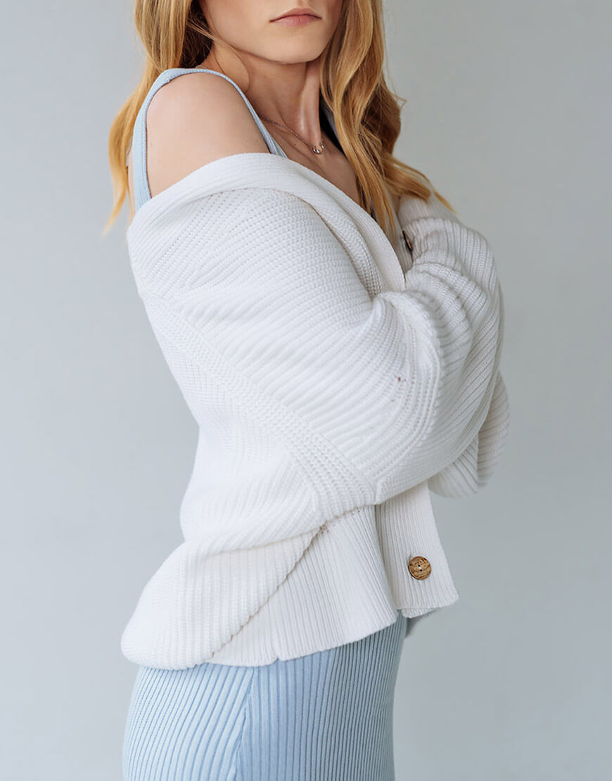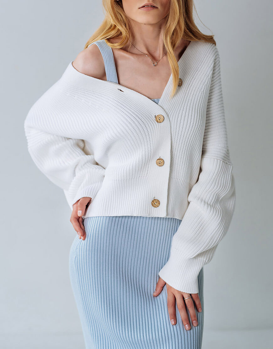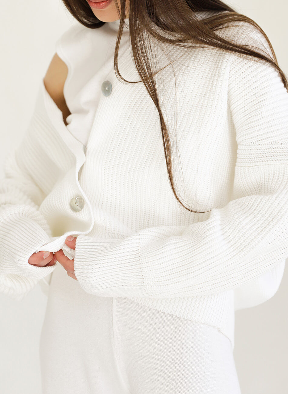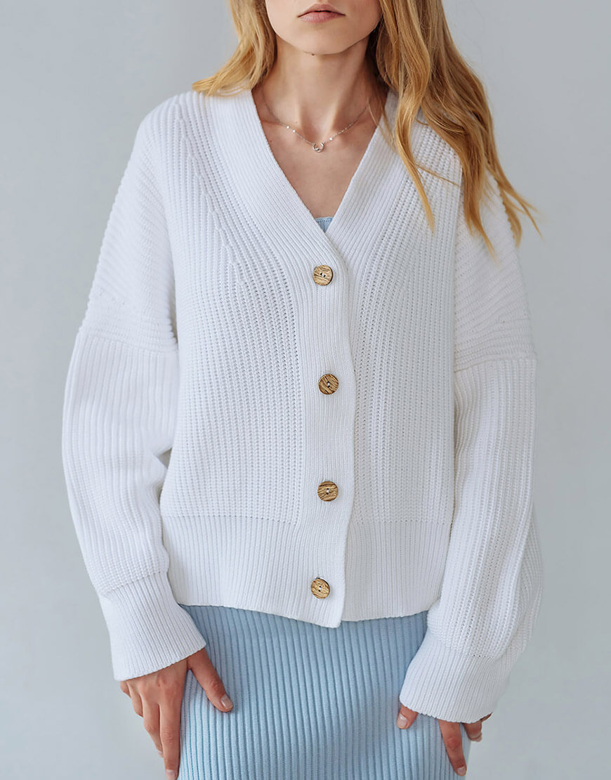 Затишний кардиган на ґудзиках контрастного кольору з бавовни. V-подібний виріз, подовжені рукави.