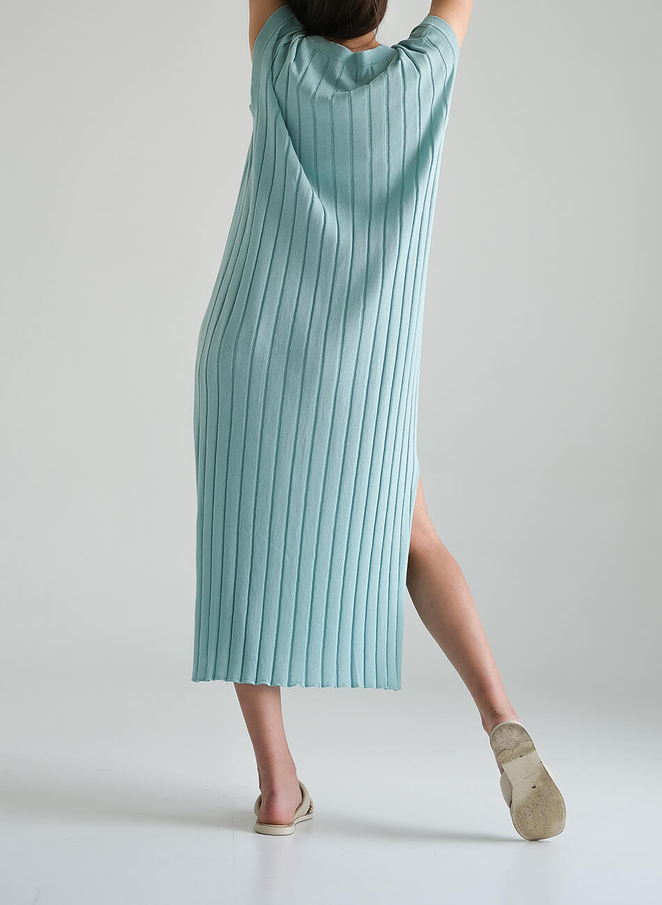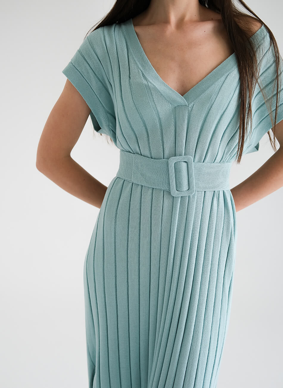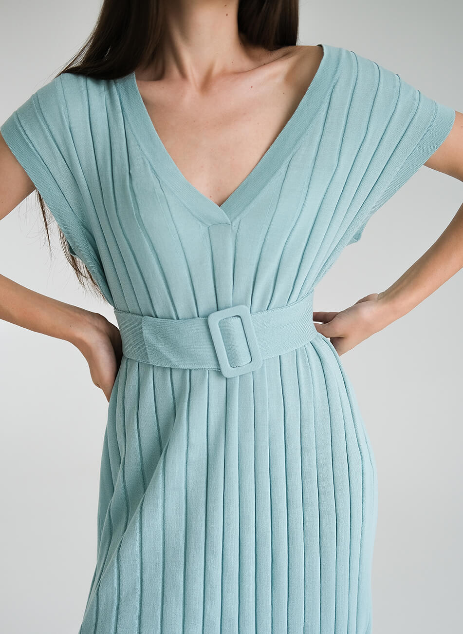 Доставка впродовж 3-10 робочих днівСукня з тонким, фактурним в’язанням з преміального італійського бавовни. Комфортний силует сукні з V-подібним вирізом і двома боковими розрізами ідеально поєднується з легкою і дуже м’якою текстурою пряжі. Завершує образ широкий пояс на талії.