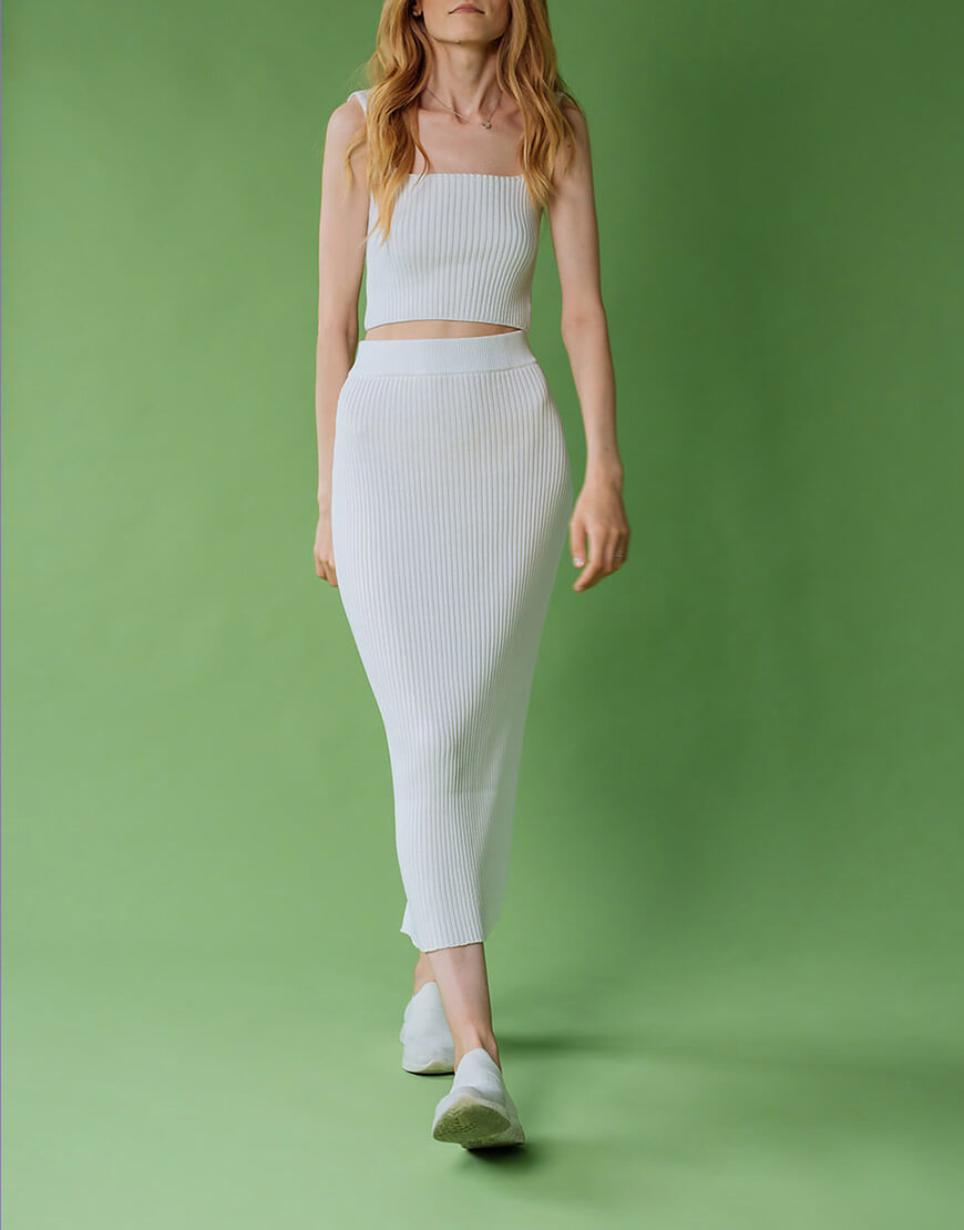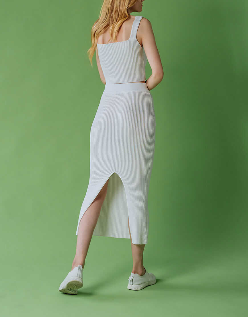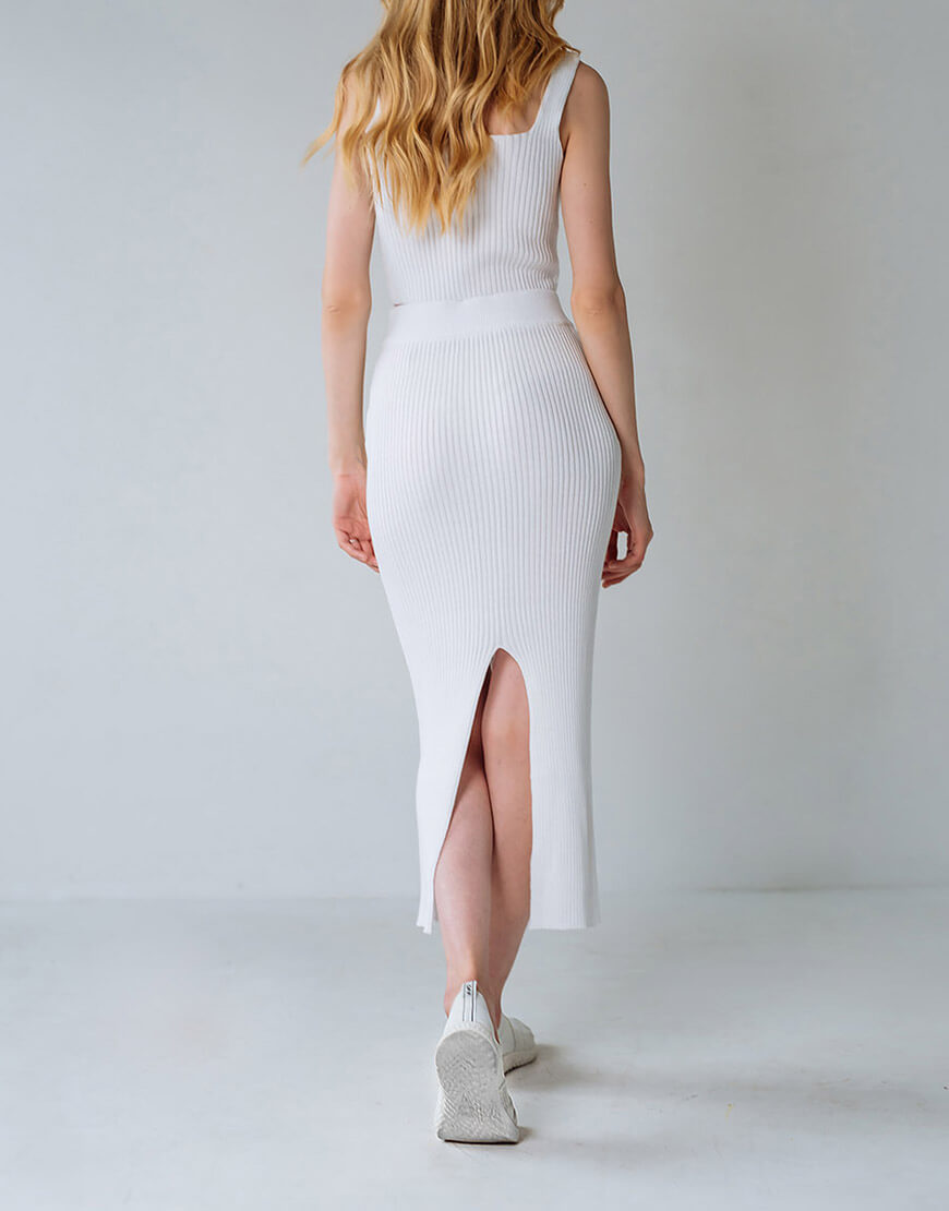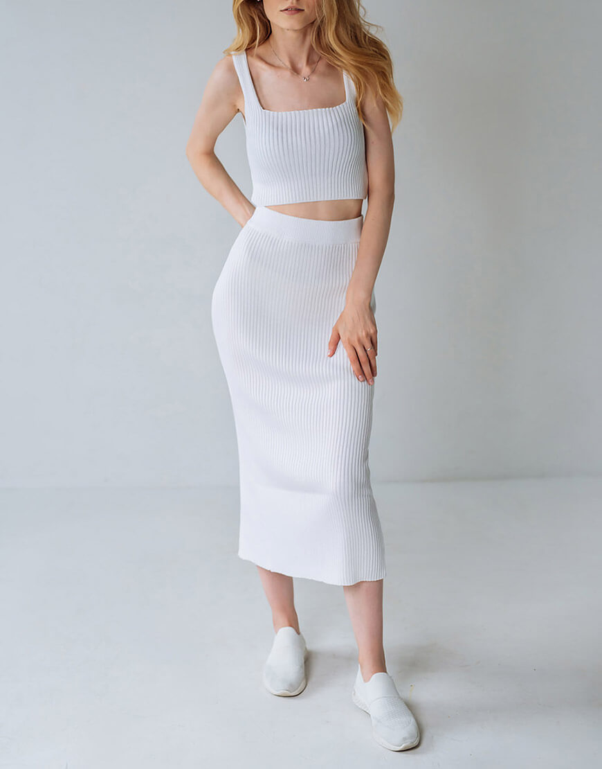 Укорочений топ із трикотажу з квадратним вирізом і широкими бретелями. Спідниця-олівець зі шліцою ззаду, з високою посадкою і еластичним поясом на гумці.