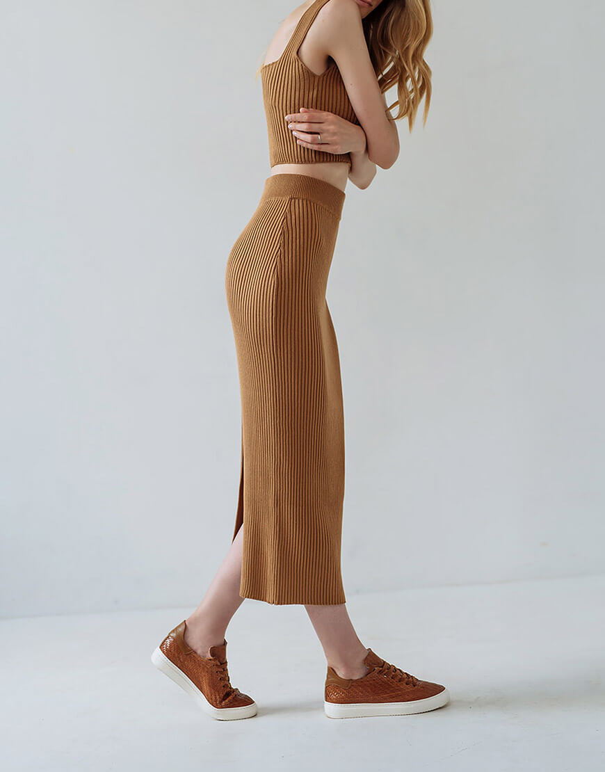 Укорочений топ із трикотажу з квадратним вирізом і широкими бретелями. Спідниця-олівець зі шліцою ззаду, з високою посадкою і еластичним поясом на гумці.