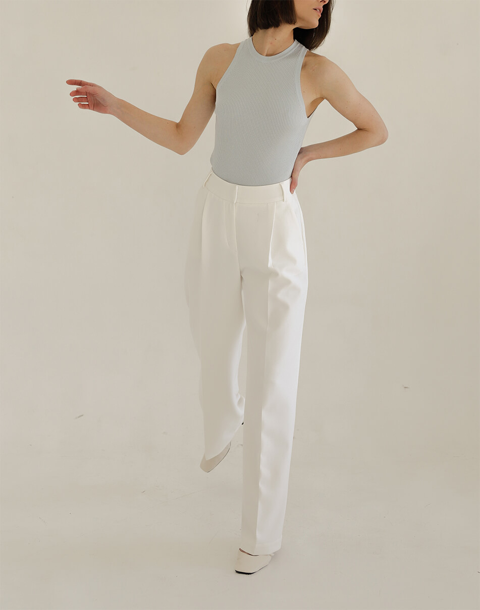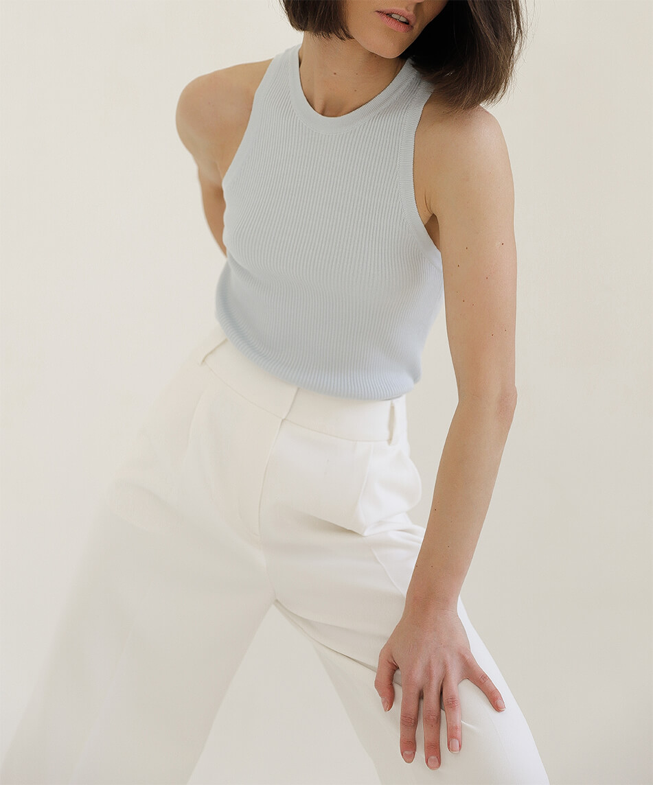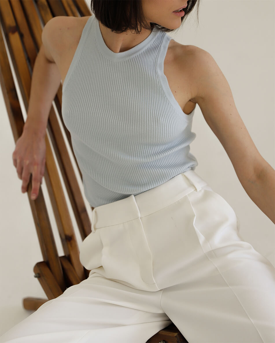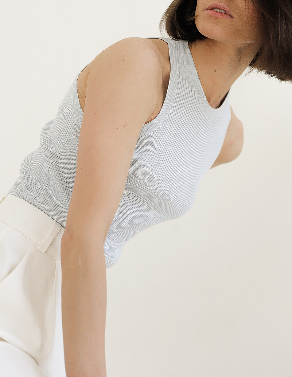 Трикотажний топ без рукавів із круглим вирізом. Деталі: в рубчик. Підходить для охоплення грудей 85-100 см.