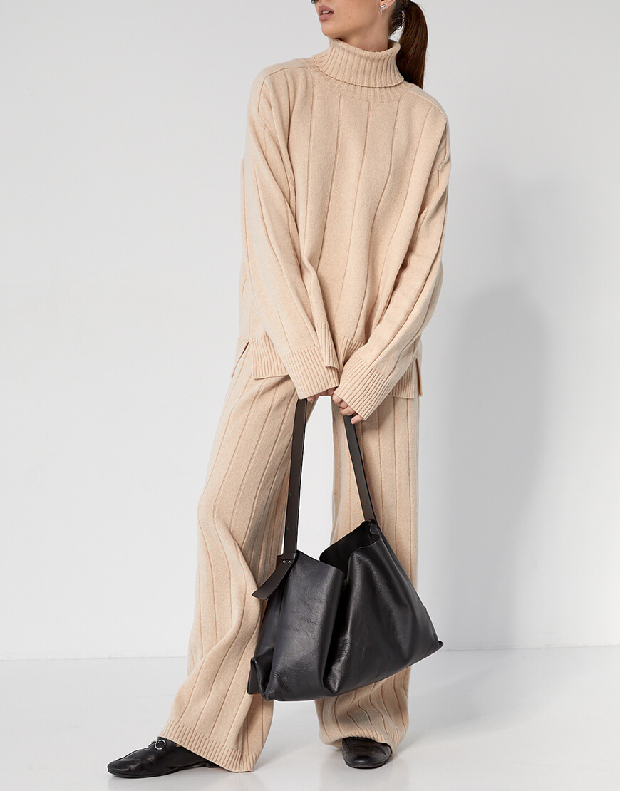 Доставка в течение 3-10 рабочих днейТрикотажний костюм виконаний зі 100% кардного мериносу і оздоблений рельєфним вертикальним візерунком. Костюм складається зі светру та штанів. Светр вільного крою з високою горловиною, що завертається та опущеною лінією плеча, довгими рукавами та боковими розрізами. Штани помірно широкі з високою посадкою та еластичним поясом.