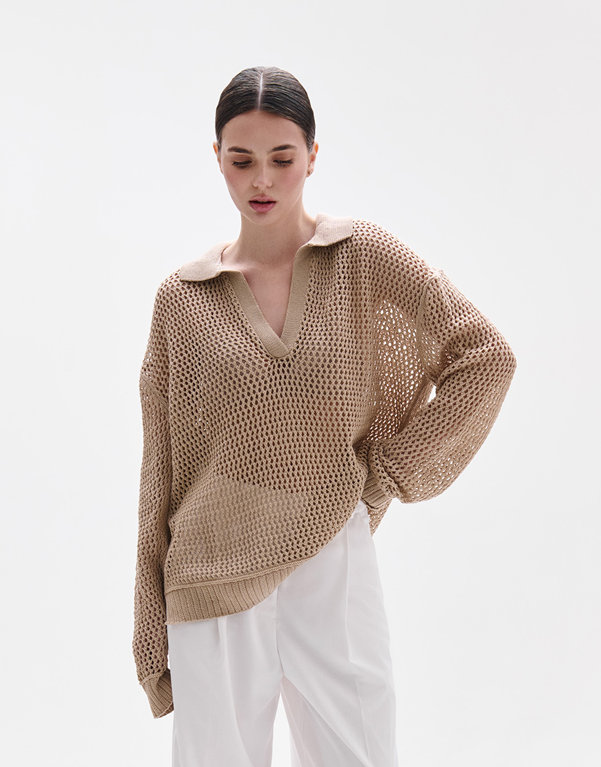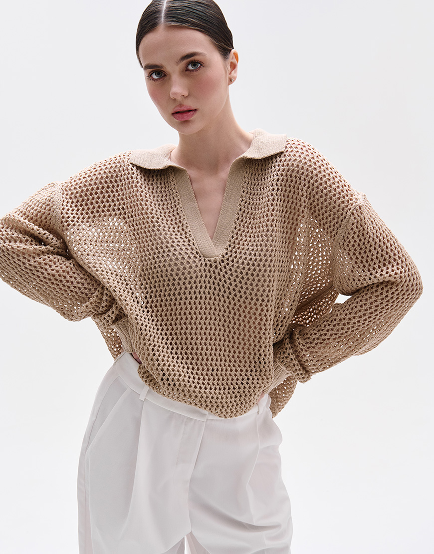 Поло виконане з натуральної пряжі – бавовни. Виріб виконаний з ажурної в’язки, вільного крою зі спущеною лінією плеча, гарно пропускає повітря і не обмежує рухи. Поло має V-образний виріз горловини, довгий рукав, комірець та планку.
