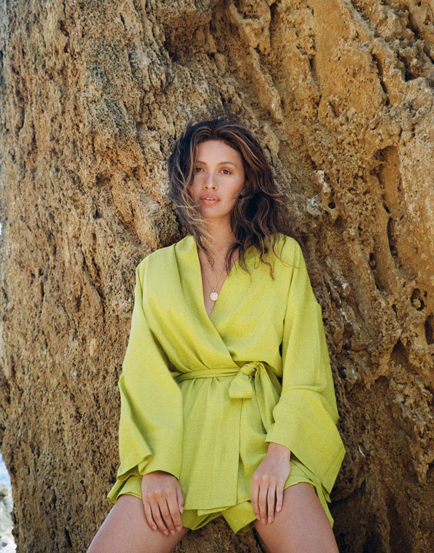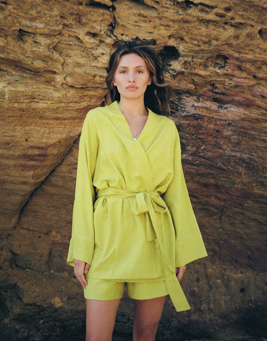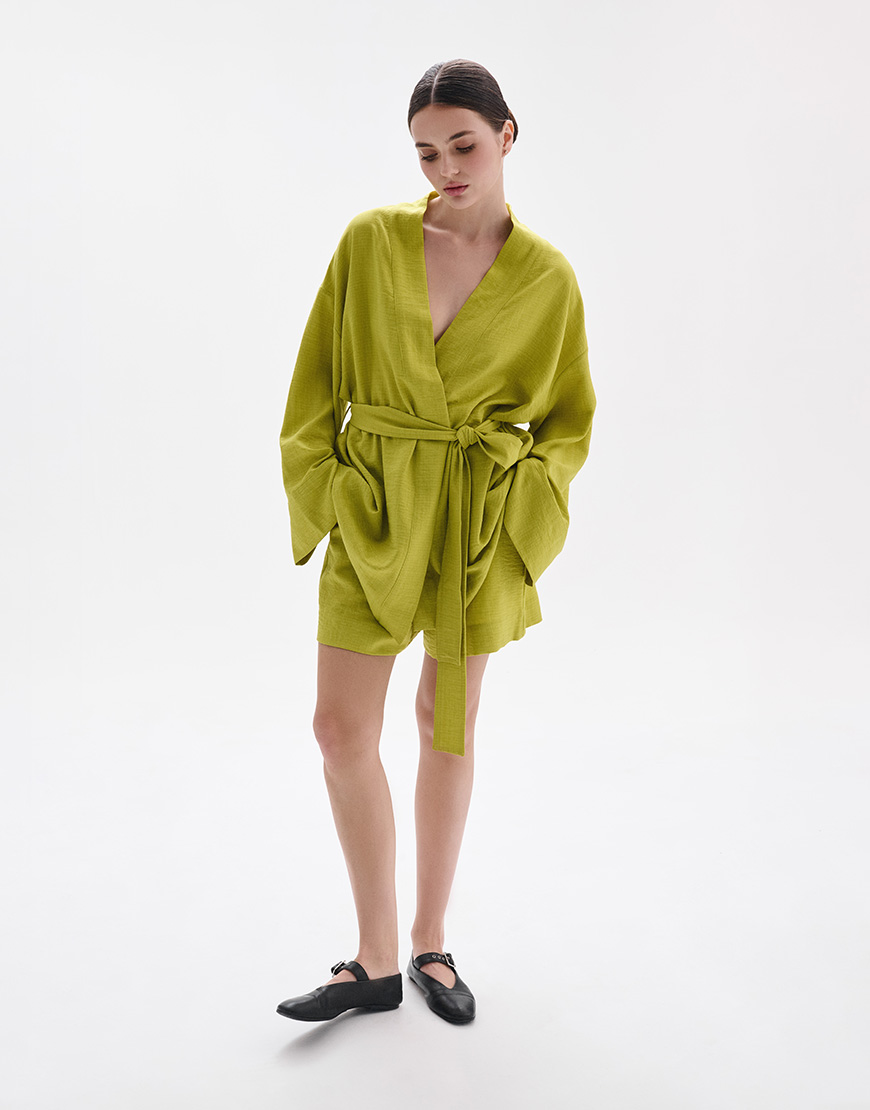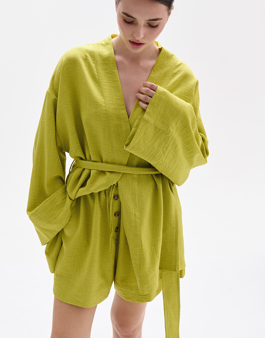 Доставка впродовж 3-10 робочих днівКостюм кімоно з льону у фісташковому кольорі. Кімоно з довгим широким рукавом з манжетом. У комплекті є пояс, що дозволяє регулювати о’бєм та підкреслить талію. Шорти вільного крою з кишенями на еластичному поясі резинці, оздоблені декоративною шнурівкою
