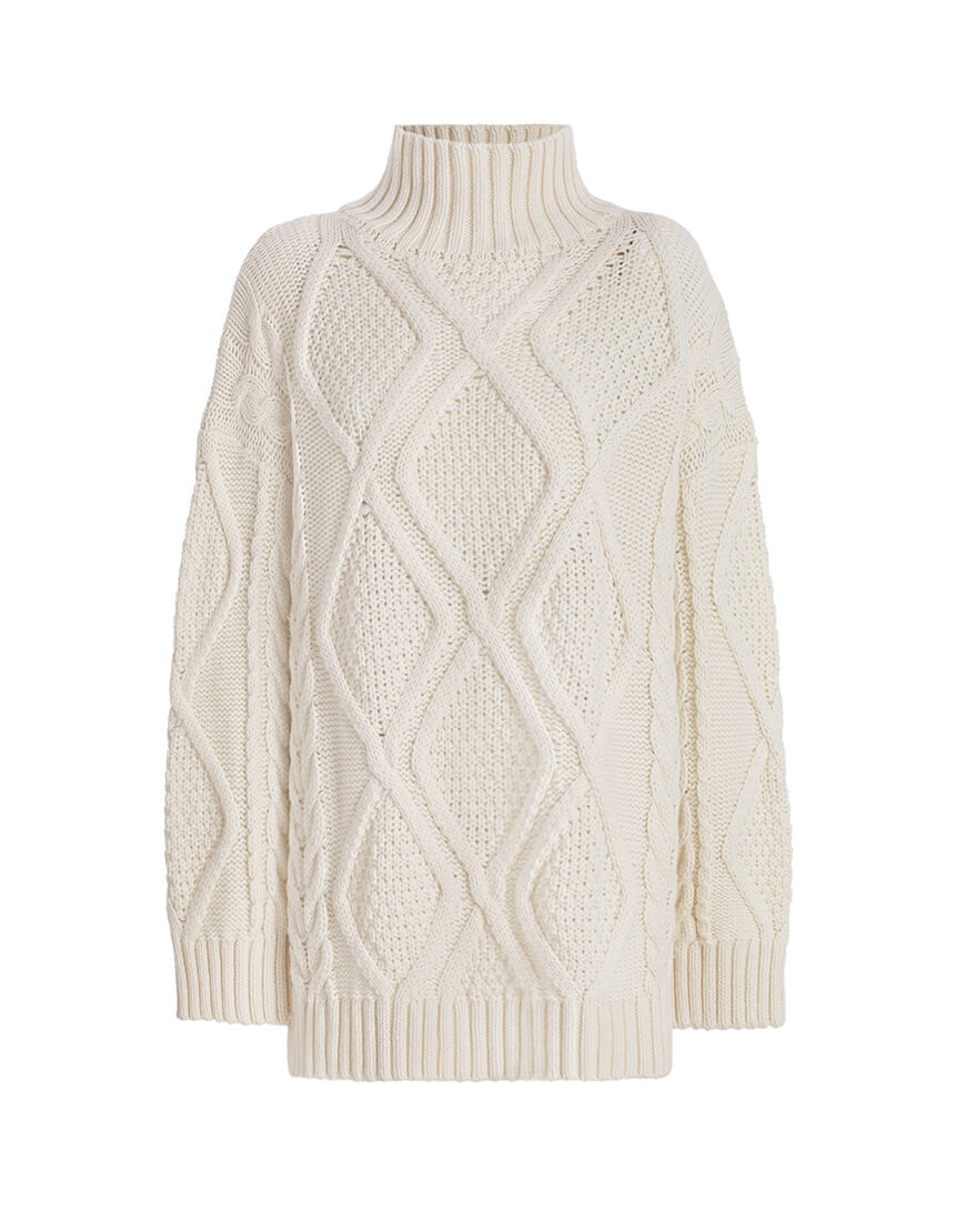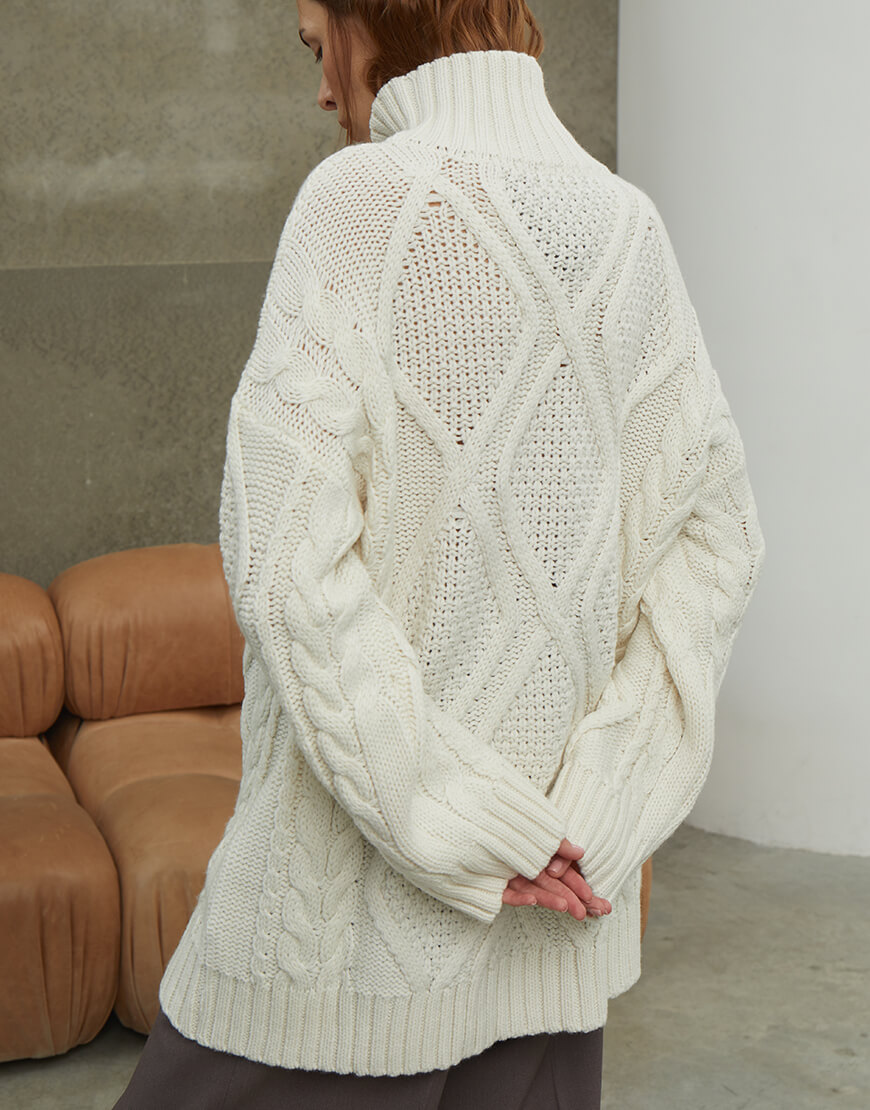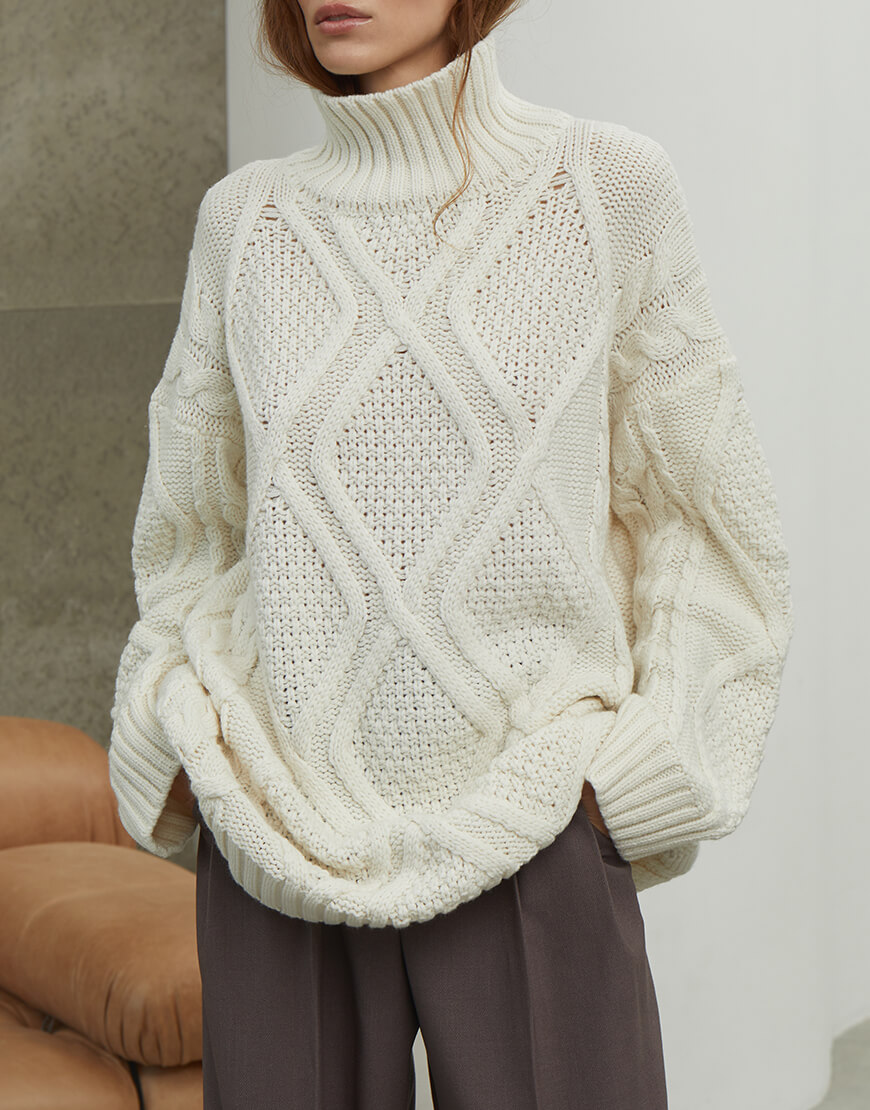 Светр з високою горловиною, вільного прямого крою з візерунком косами.