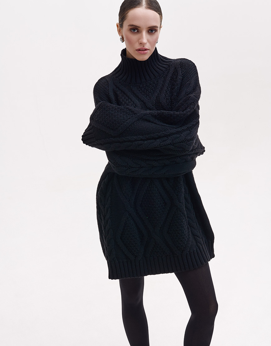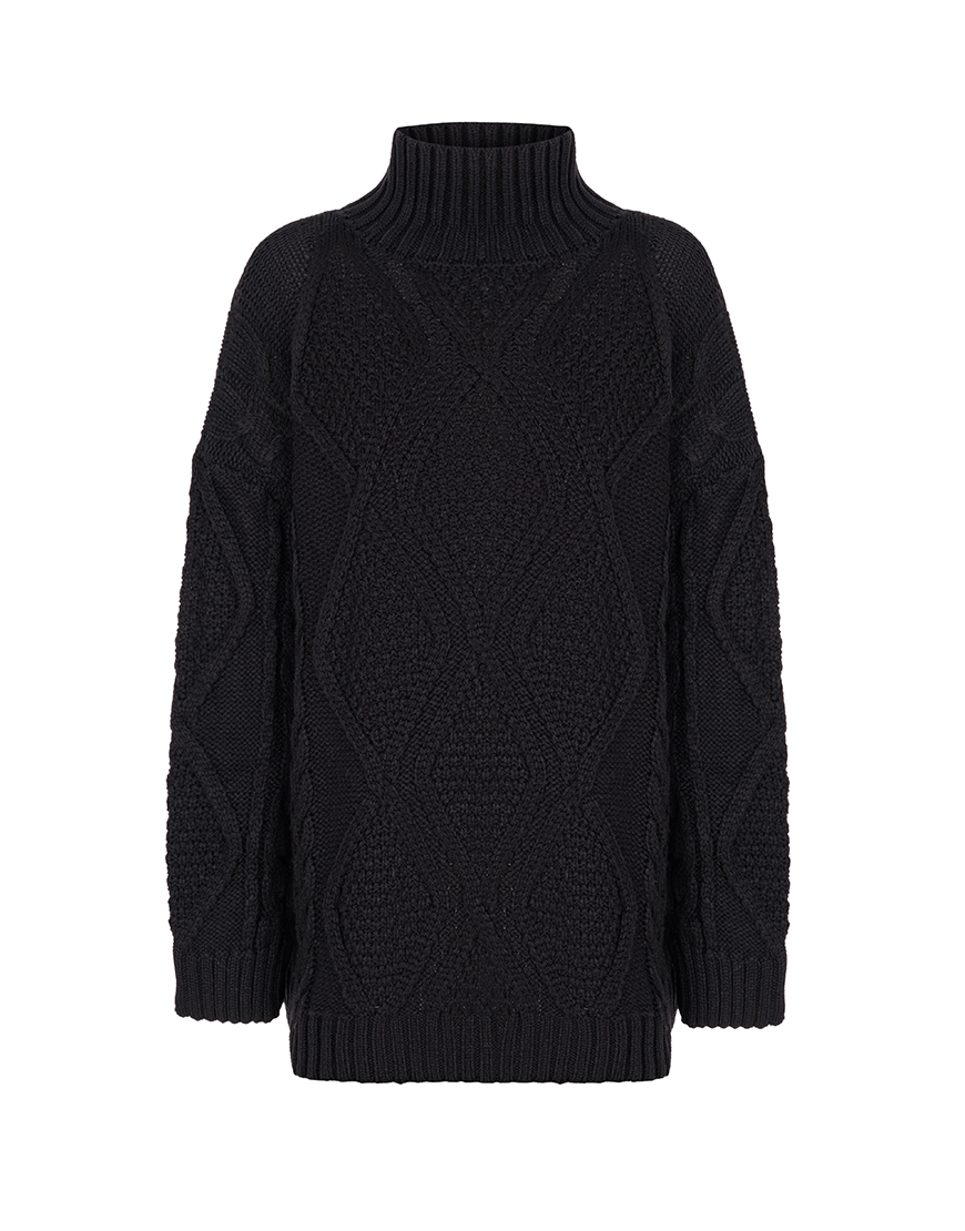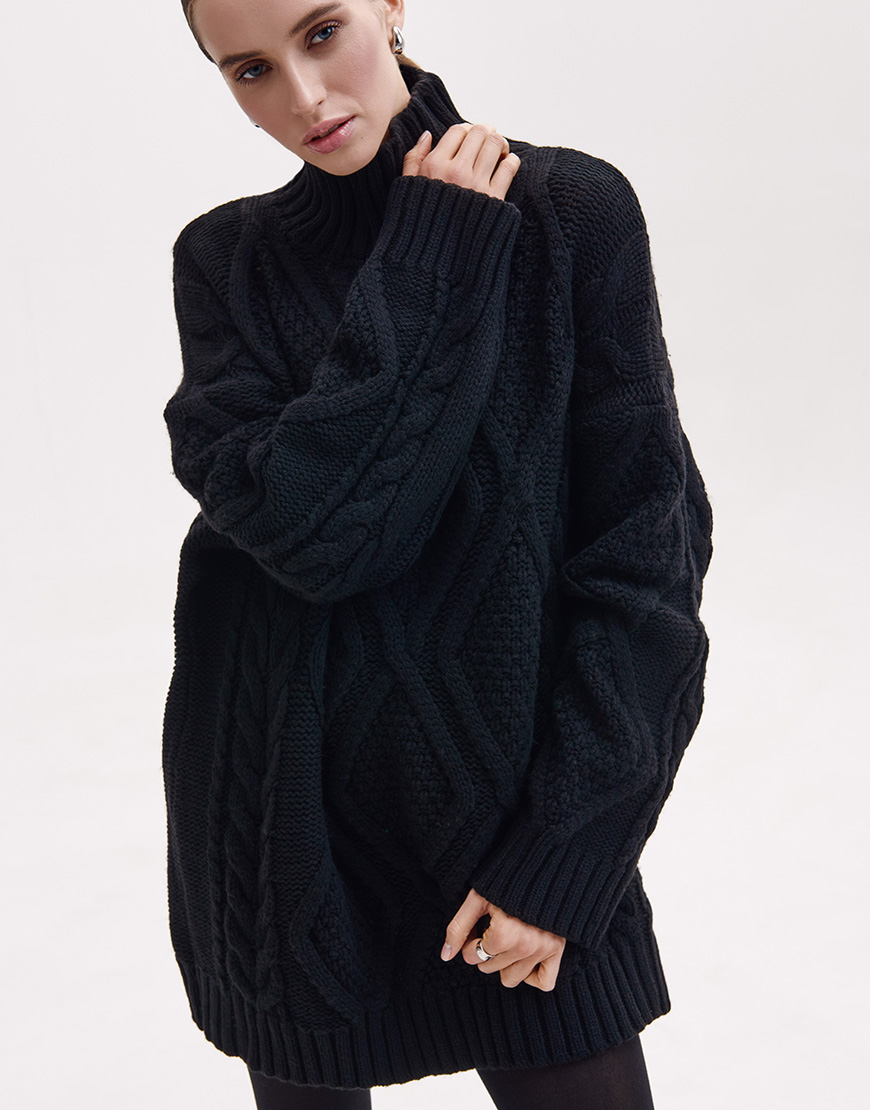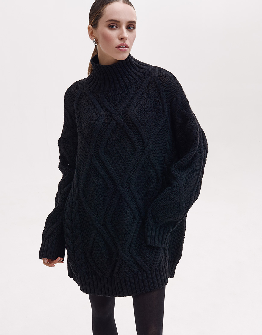Доставка впродовж 3-10 робочих днівСветр з високою горловиною, вільного прямого крою з візерунком косами.