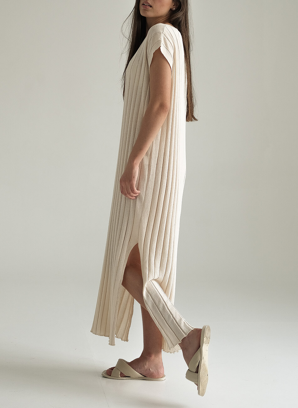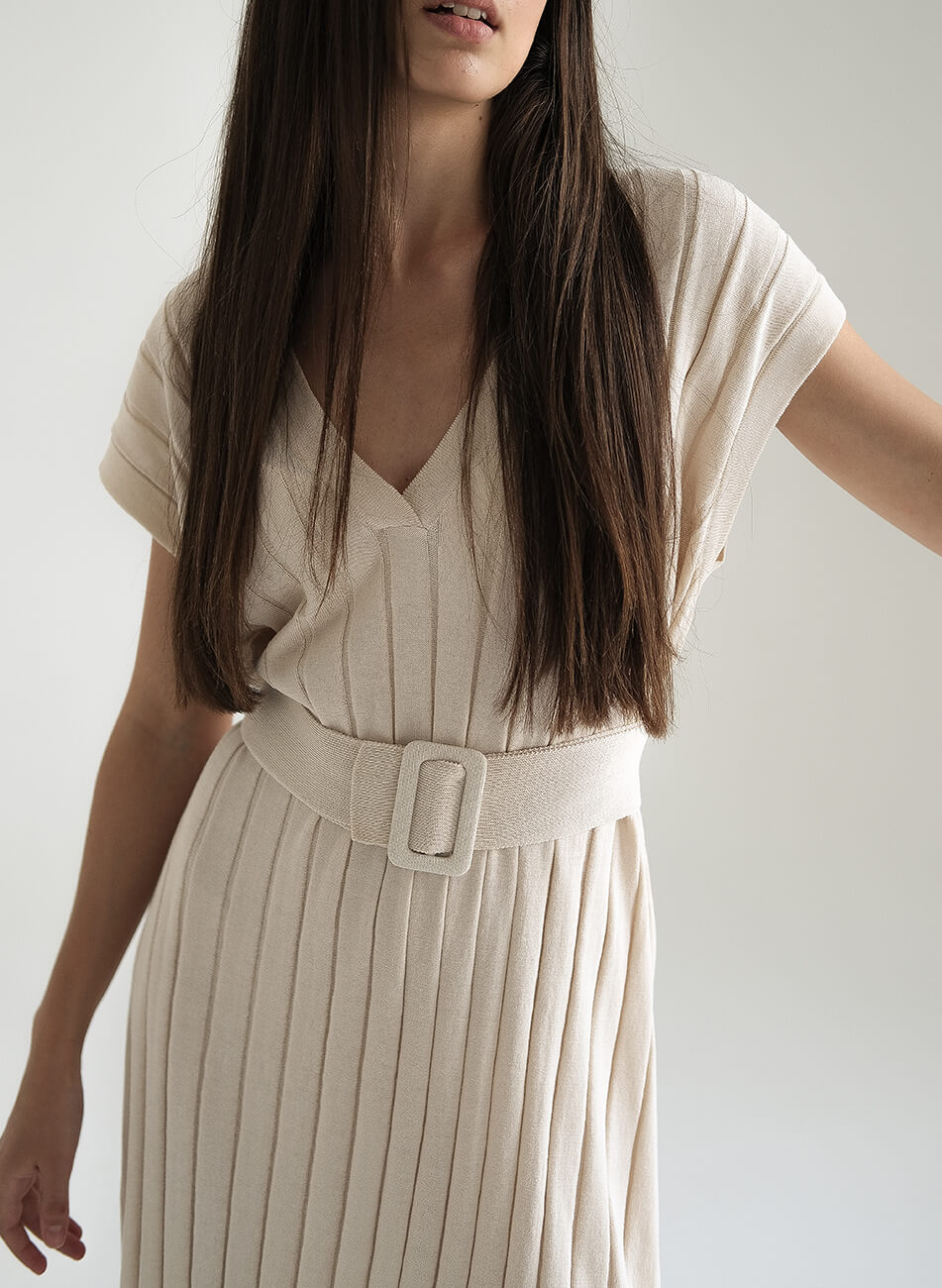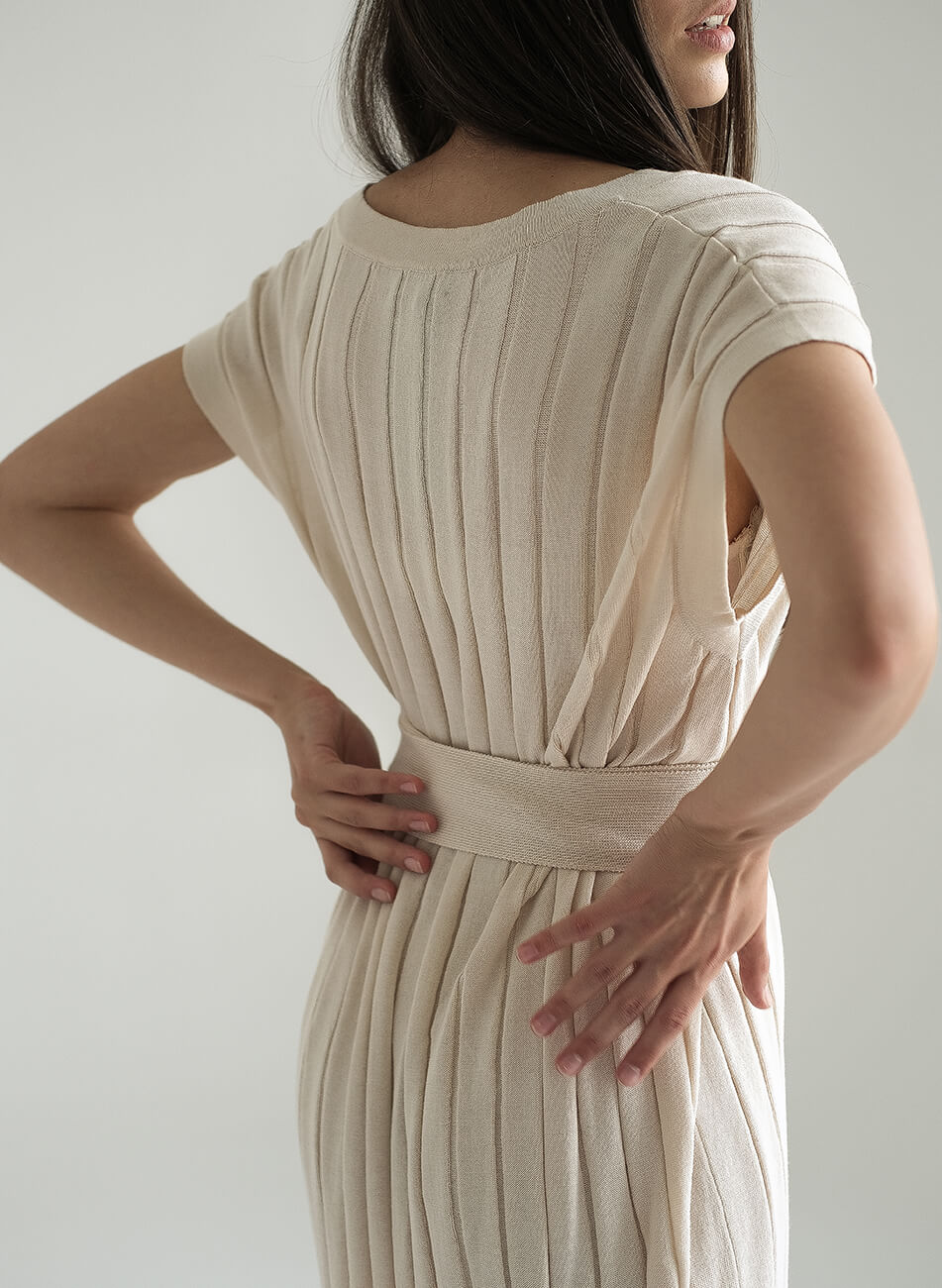 Сукня з тонкої, фактурної в’язки з преміальної італійської бавовни. Комфортний силует сукні з V-подібним вирізом і двома бічними розрізами, ідеально поєднується з легкою і дуже м’якою текстурою пряжі. Завершує образ широкий пояс на талії.