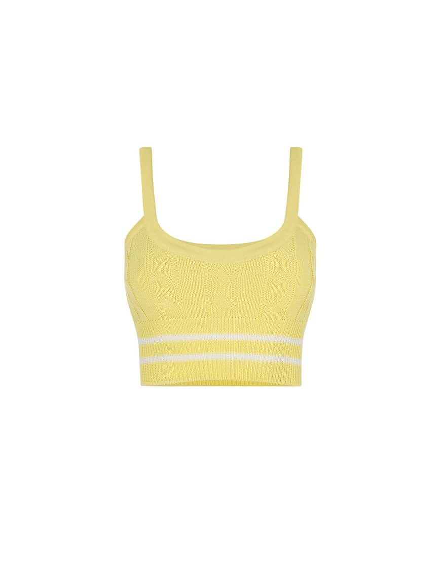 Доставка впродовж 3-10 робочих днівТоп з трикотажу з фактурним візерунком косами на тонких бретелях з контрастною окантовкою.