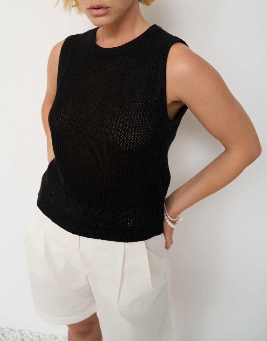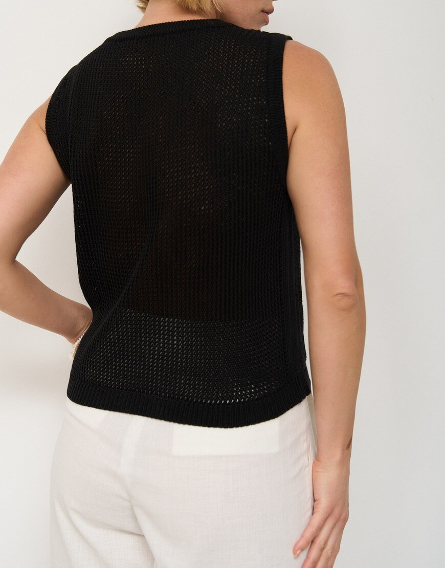 Доставка впродовж 3-10 робочих днівТоп з ажурного трикотажу з круглим вирізом, без рукавів.