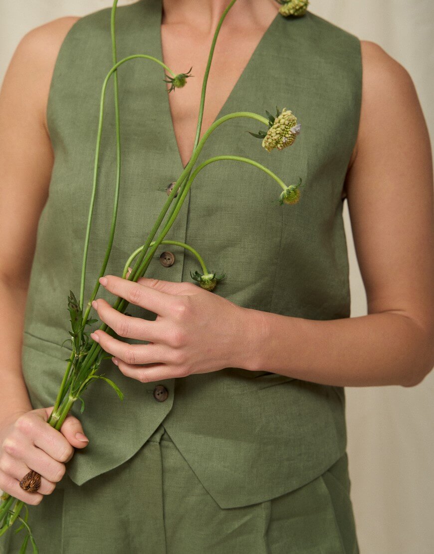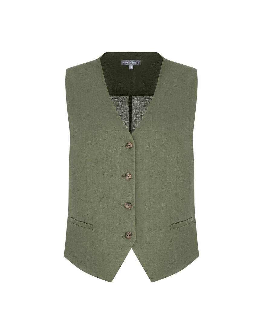 Доставка впродовж 3-10 робочих днівЖилет із 100% льону. Застібки на гудзики. Дві кишені з обшивкою.