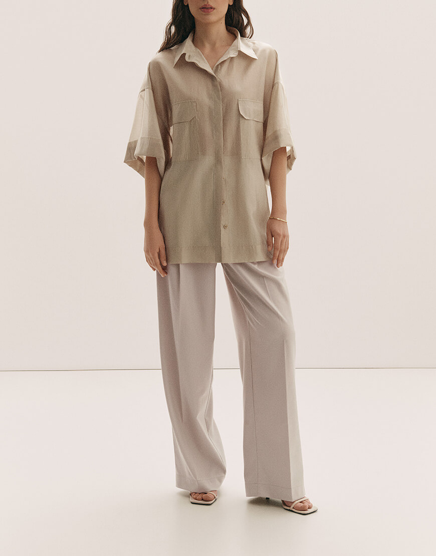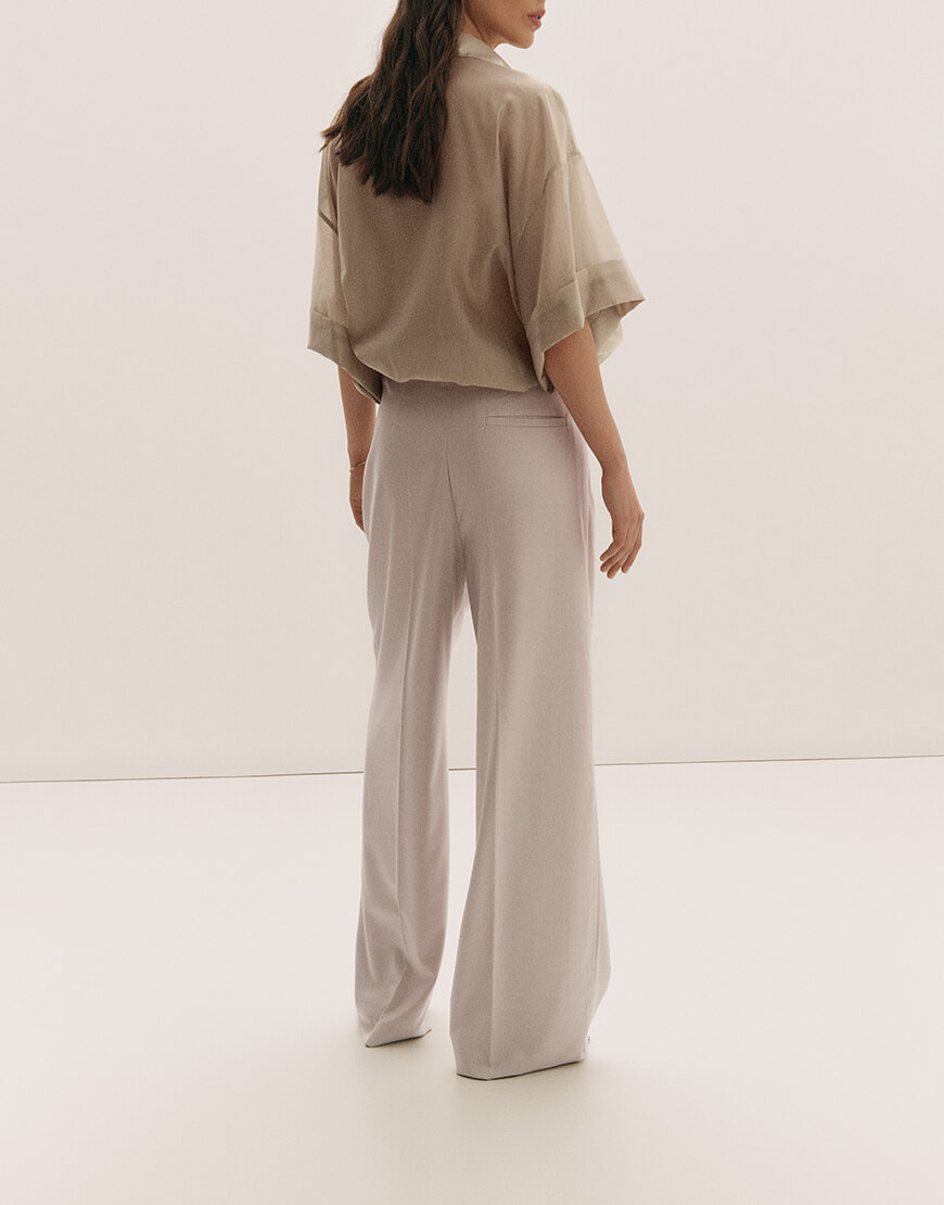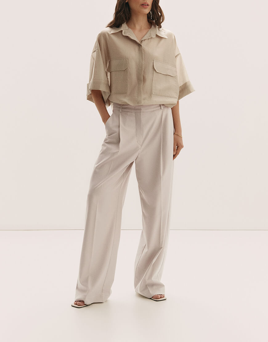 Доставка впродовж 3-10 робочих днівШтани прямого крою з бавовняної тканини середньої посадки з декоративною складкою і стрілками спереду. Дизайн штанів доповнюють бокові та задні кишені. Застібка на металеві гачки всередині.