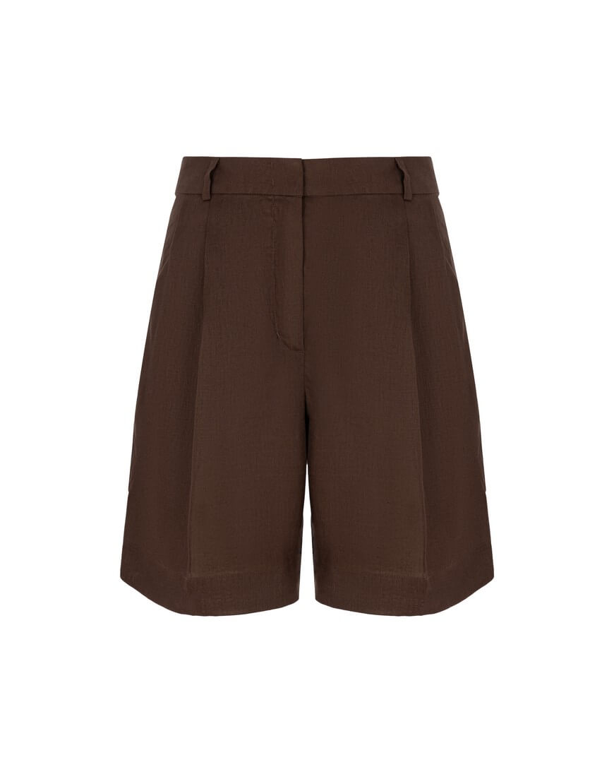 Лляні шорти із защипами. Виготовлені зі 100% льону. Застібаються на блискавку, гудзик та гачки. Дві бічні кишені. Петельки для ременя на поясі.