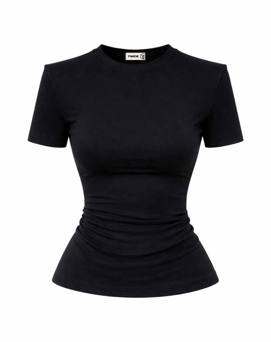 Стильна базова футболка, яка красиво підкреслює фігуру та робить образ більш виразним. Завдяки плечикам силует виглядає структурніше, а посадка — більш зібраною та ефектною.