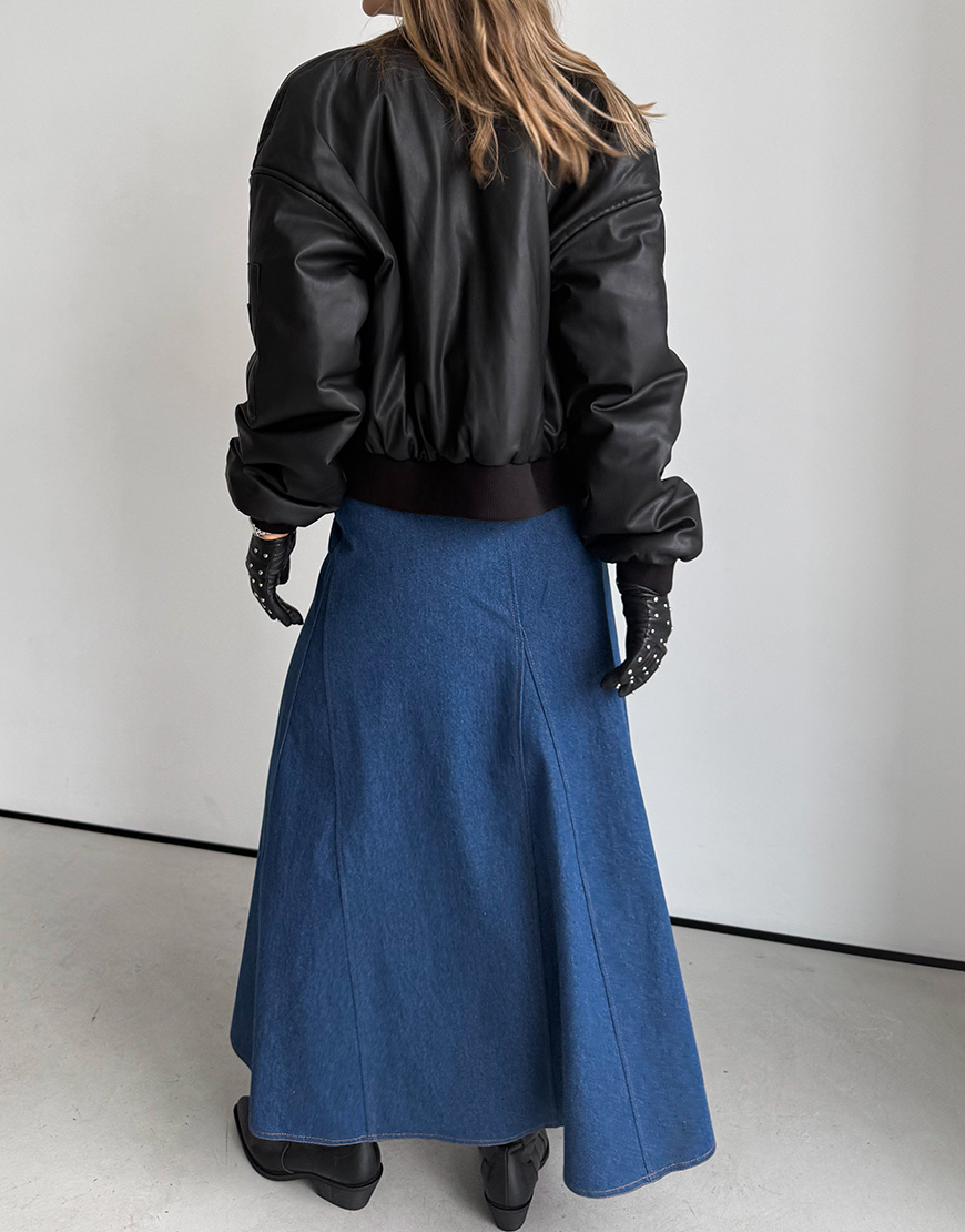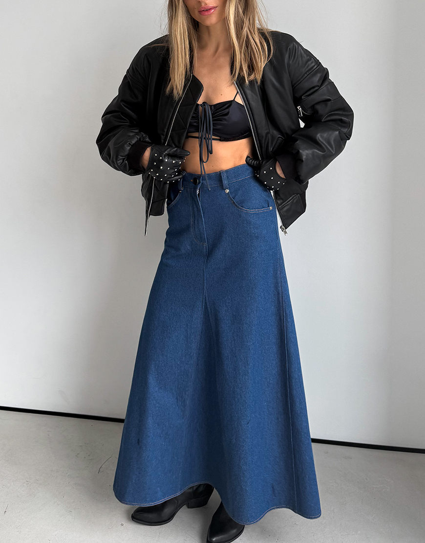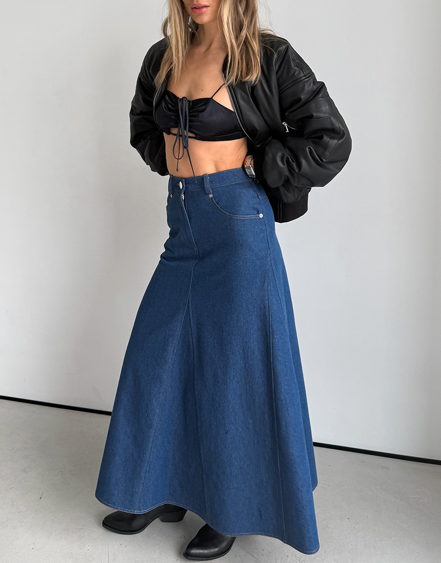 Доставка впродовж 2-5 робочих днівСпідниця-кльош високої посадки з резинкою позаду на поясі, із щільного джинсу