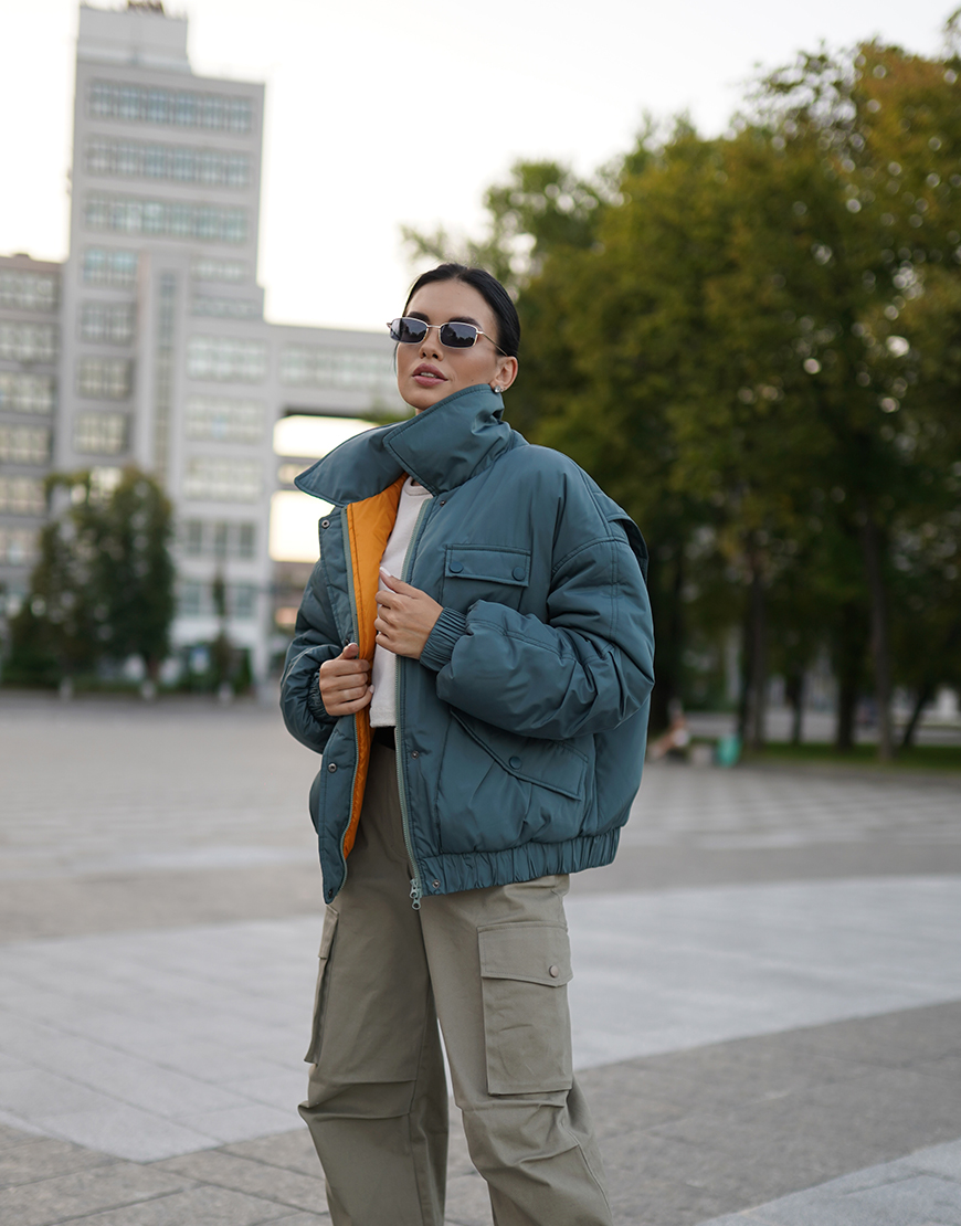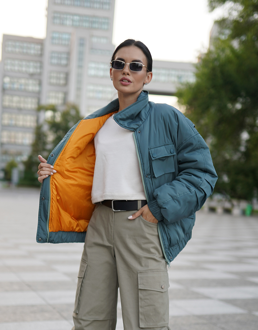 Доставка впродовж 2-5 робочих днівОб’ємна куртка оверсайз зі спущеним плечем, накладними функціональними кишенями та відкладним коміром. Розрахована на температуру до 0 градусів.