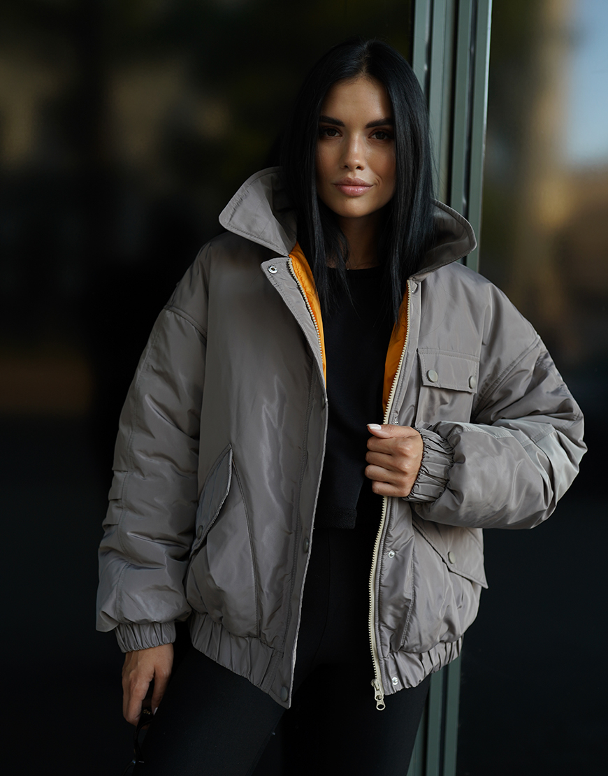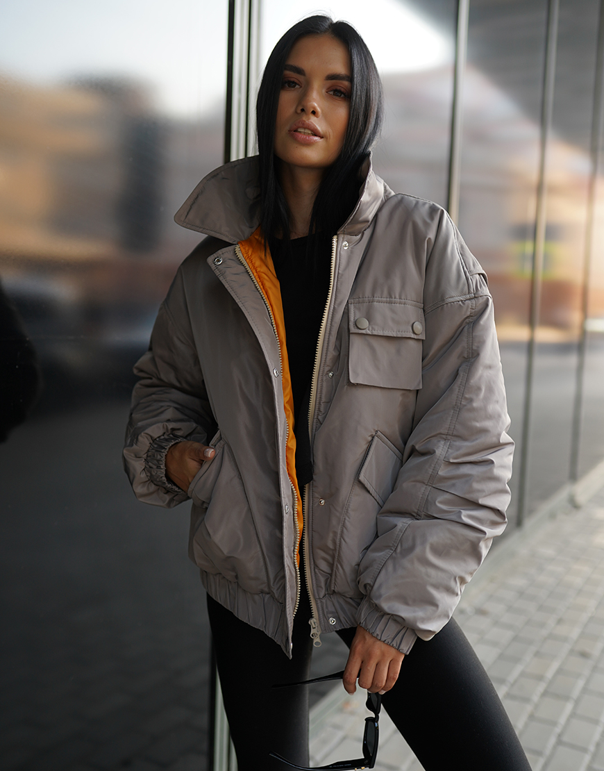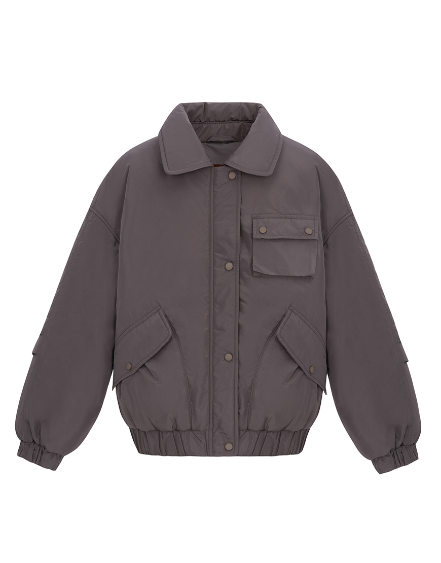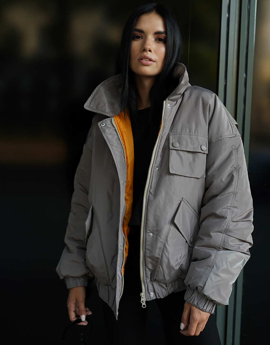 Об’ємна куртка оверсайз зі спущеним плечем, накладними функціональними кишенями та відкладним коміром. Розрахована на температуру до 0 градусів.