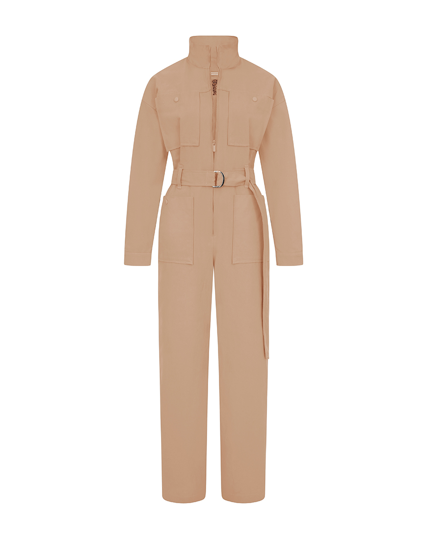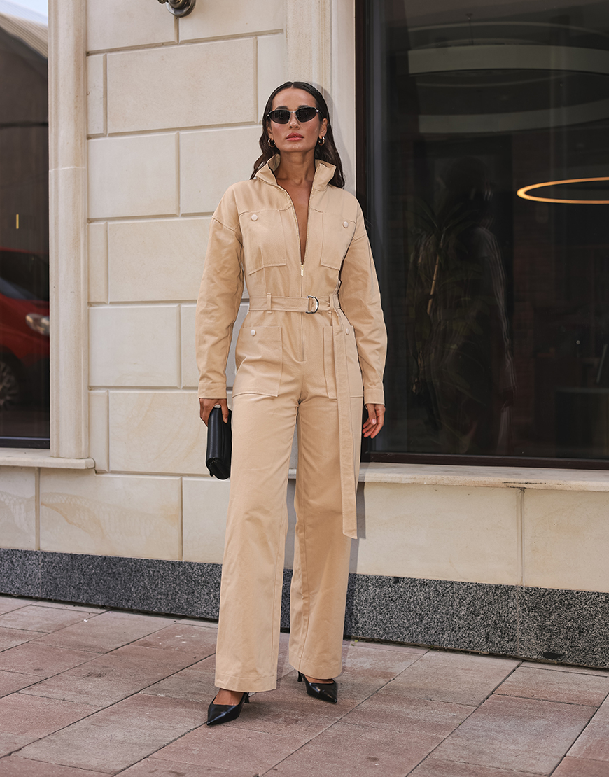 Доставка впродовж 2-5 робочих днівКомбінезон із щільного джинсу на блискавці, з брюками прямого крою, накладними кашенями та паском.