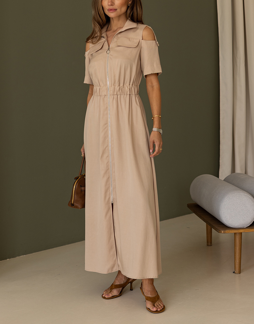 Доставка впродовж 2-5 робочих днівСукня міді-довжини вільного крою з відкритими плечима, резинкою на талії та застібкою-блискавкою