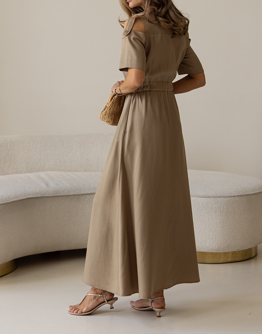 Доставка впродовж 2-5 робочих днівСукня міді-довжини вільного крою з відкритими плечима, резинкою на талії та застібкою-блискавкою