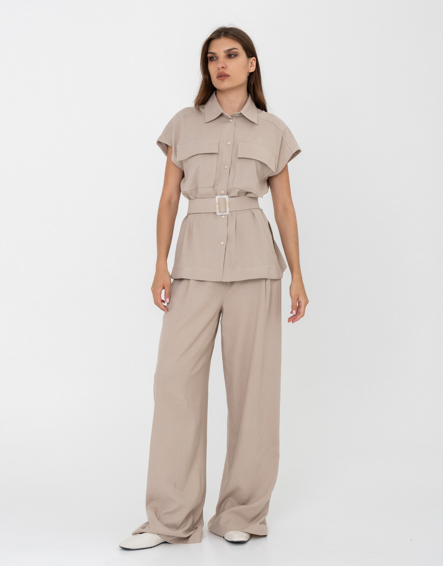 Доставка впродовж 2-5 робочих днівСорочка зі спущеним плечем без рукавів, на кнопках, з накладними карманами та зйомним паском. Брюки-палаццо високої посадки з кишенями та резинкою позаду на поясі.