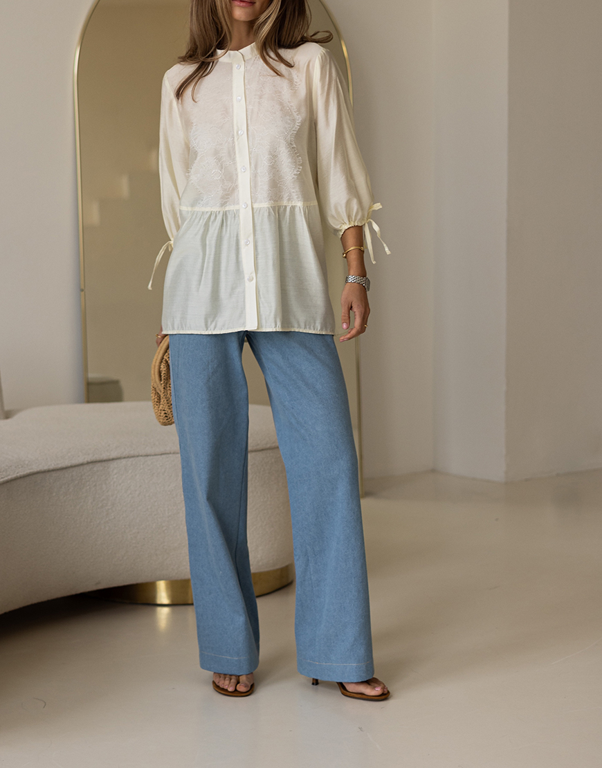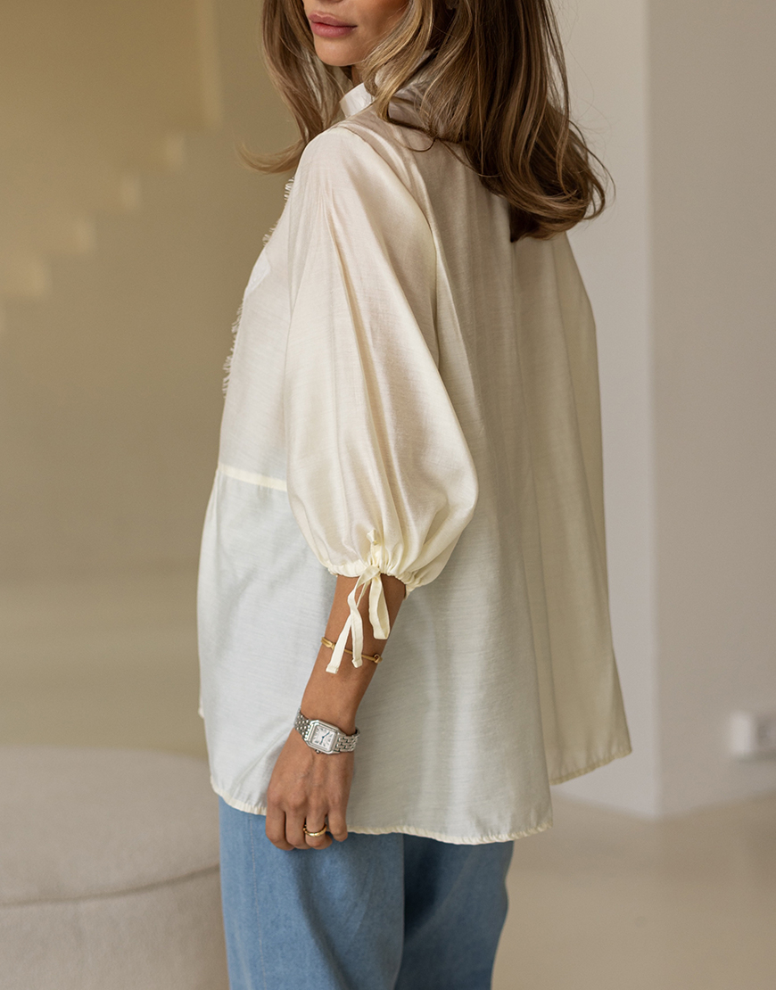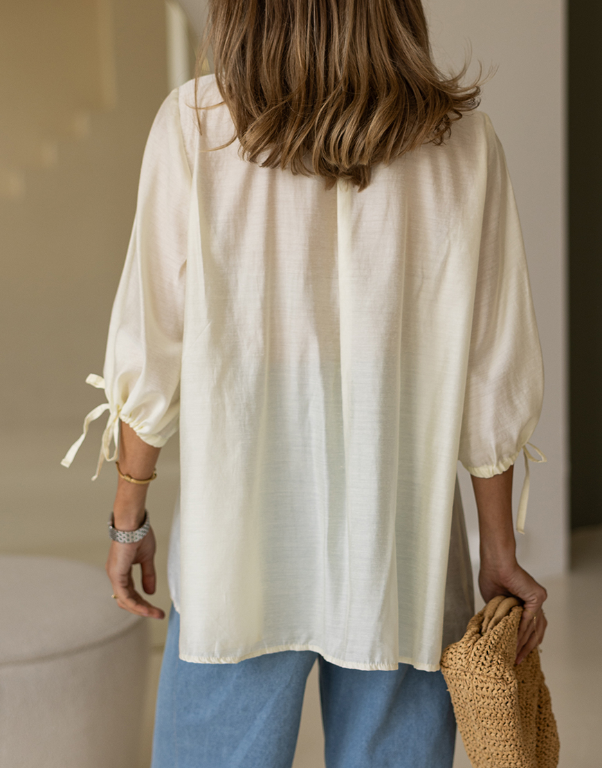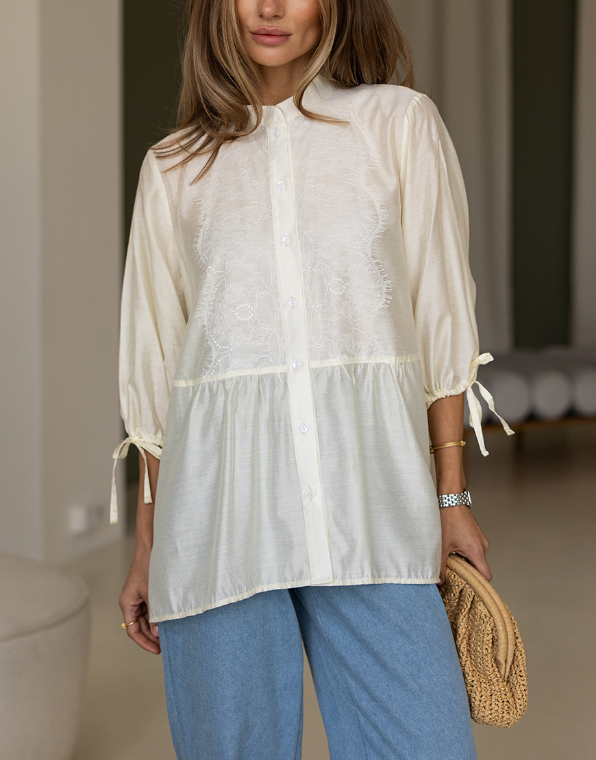 Доставка впродовж 2-5 робочих днівБлуза вільного крою із французьким мреживом, на гудзиках, з розклешеним низом та рукавами на зав’язках