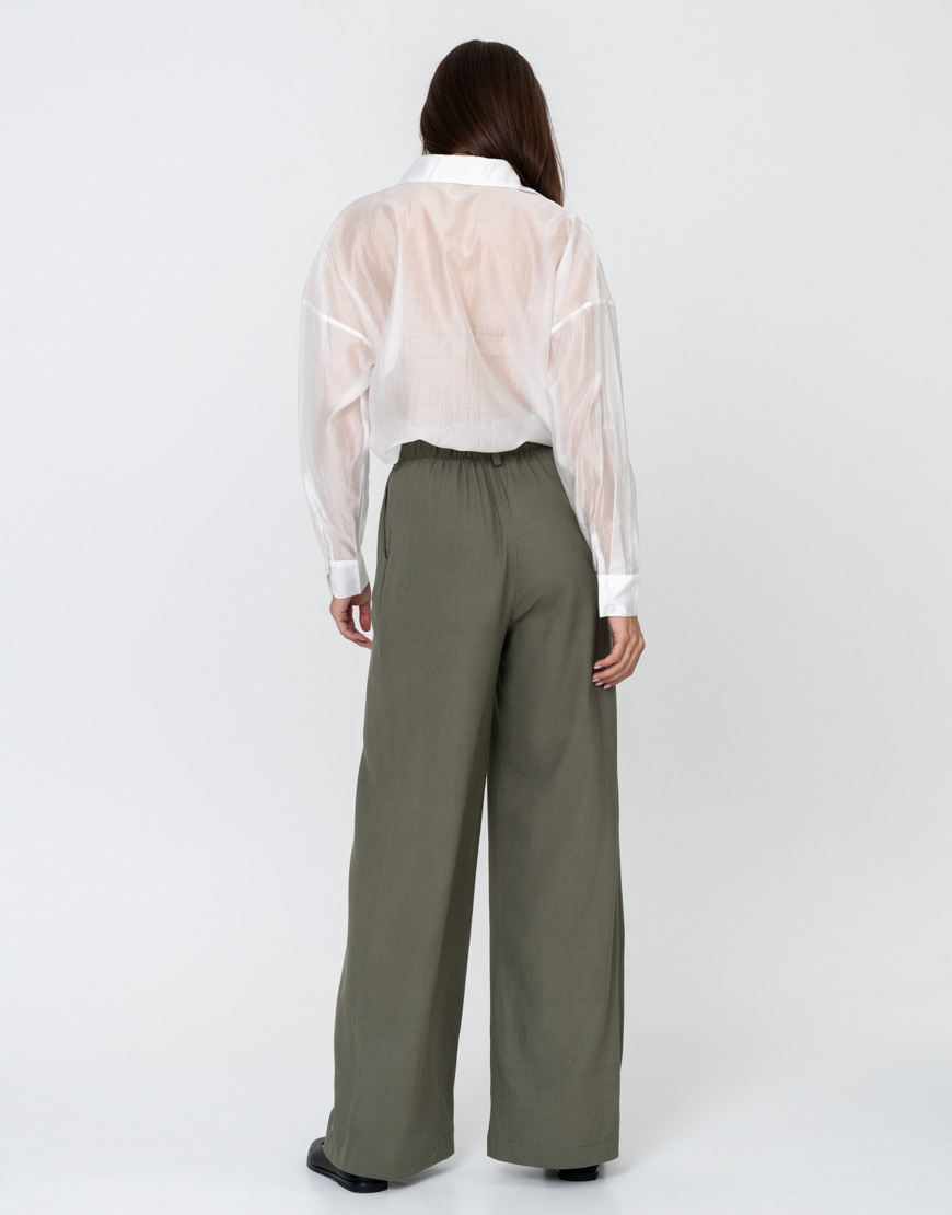Доставка впродовж 2-5 робочих днівБрюки-палаццо високої посадки з кишенями у бокових швах та резинкою позаду на поясі.