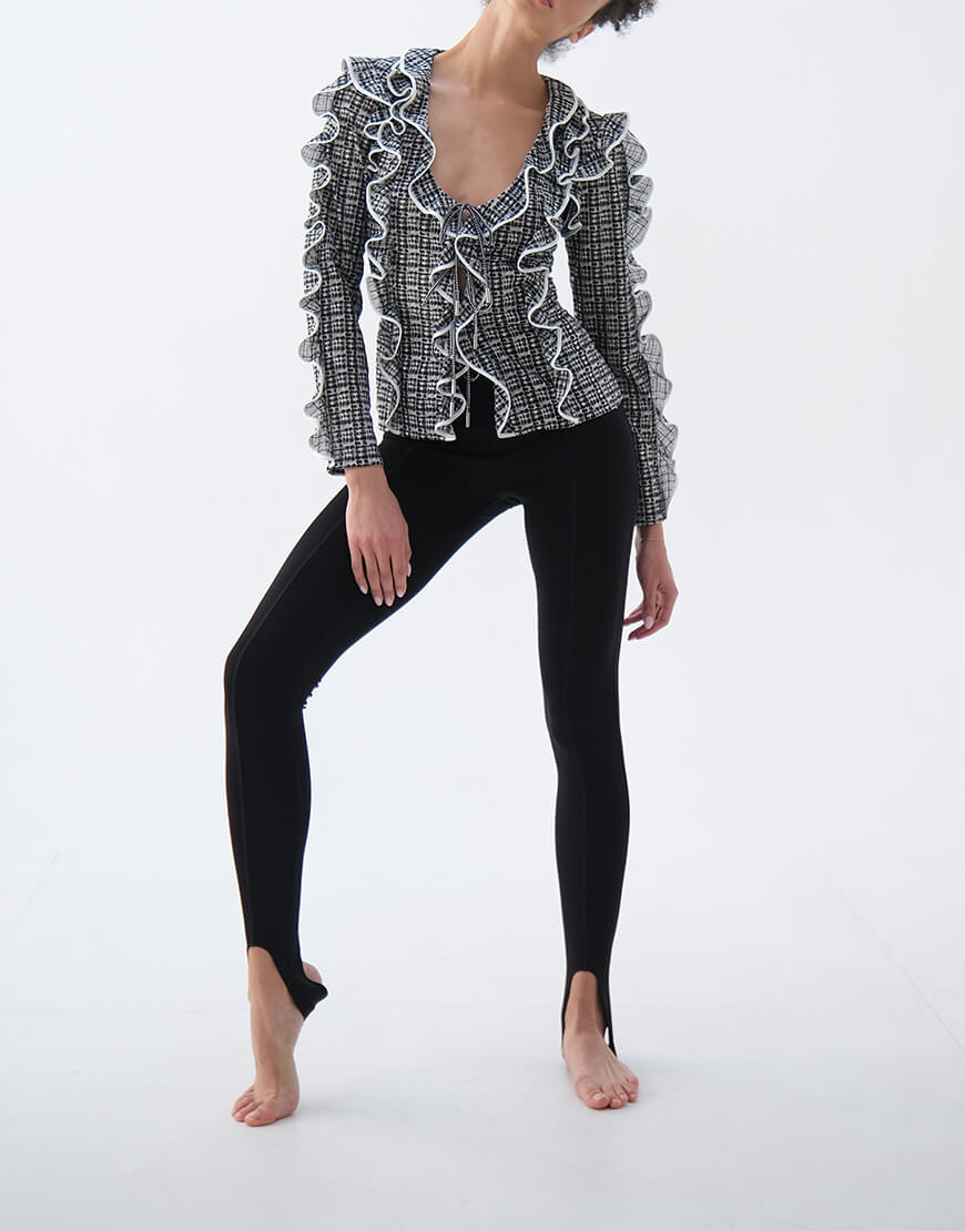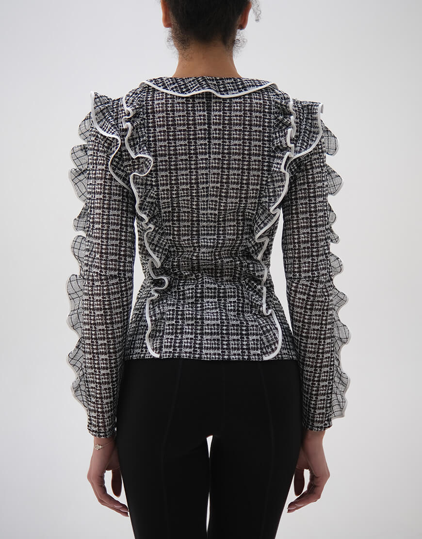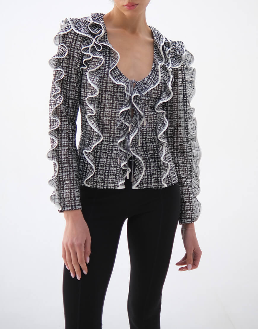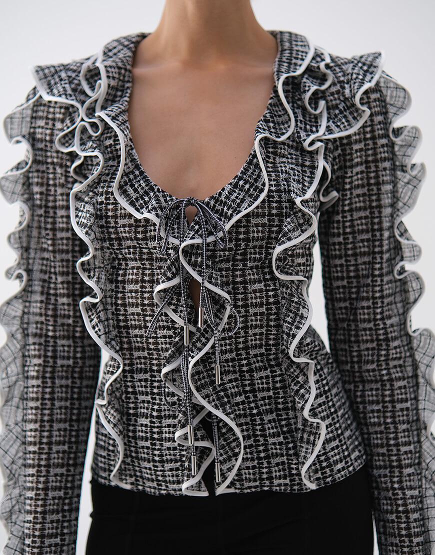 Доставка впродовж 2-5 робочих днівБлуза приталена з воланами, з вишитої сітки, з контрастним обробленням країв, на зав’язках, напівпрозора