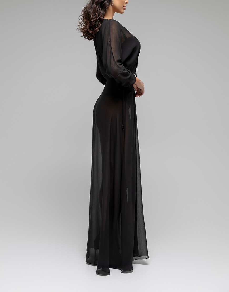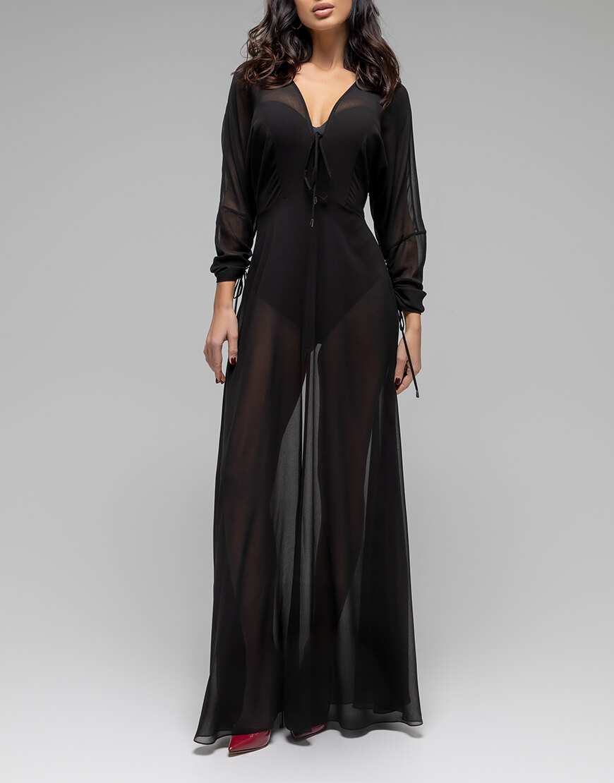 Доставка впродовж 2-5 робочих днівСукня напівпрозора, довга, з рукавом, глибоким вирізом по переду і розрізом, має декоротивні зав*язки та фурнітуру, блискавка в боковому шві
