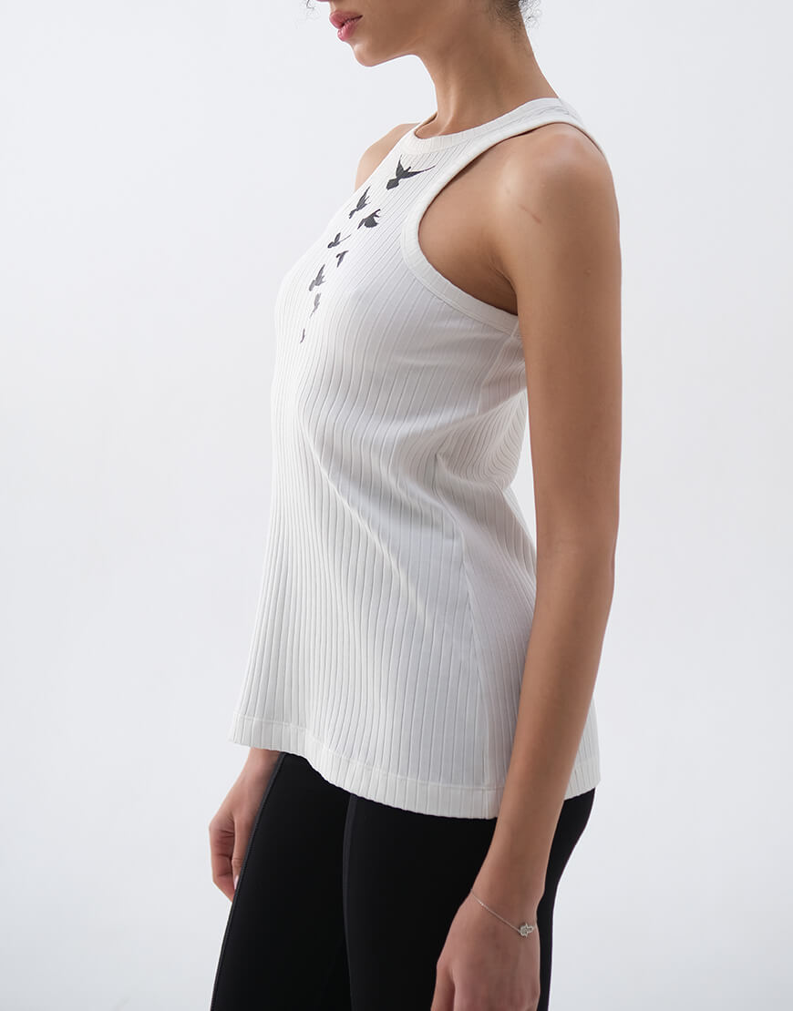 Доставка впродовж 2-5 робочих днівМайка приталеного силуету трикотажна з принтом у вигляді пташок, та декоративними надписами
