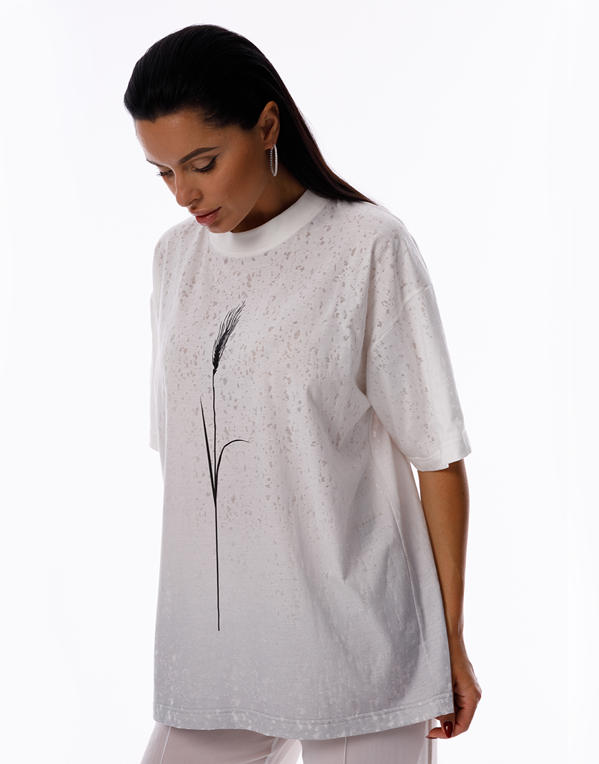 Доставка впродовж 2-5 робочих днівФутболка довга вільного крою має друк спереду у вигляді Колоска та позаду у вигляді Пташок разом з лого бренду. Тканина має градієнт сірого кольору та напівпрозорі плямки у фактурі тканини