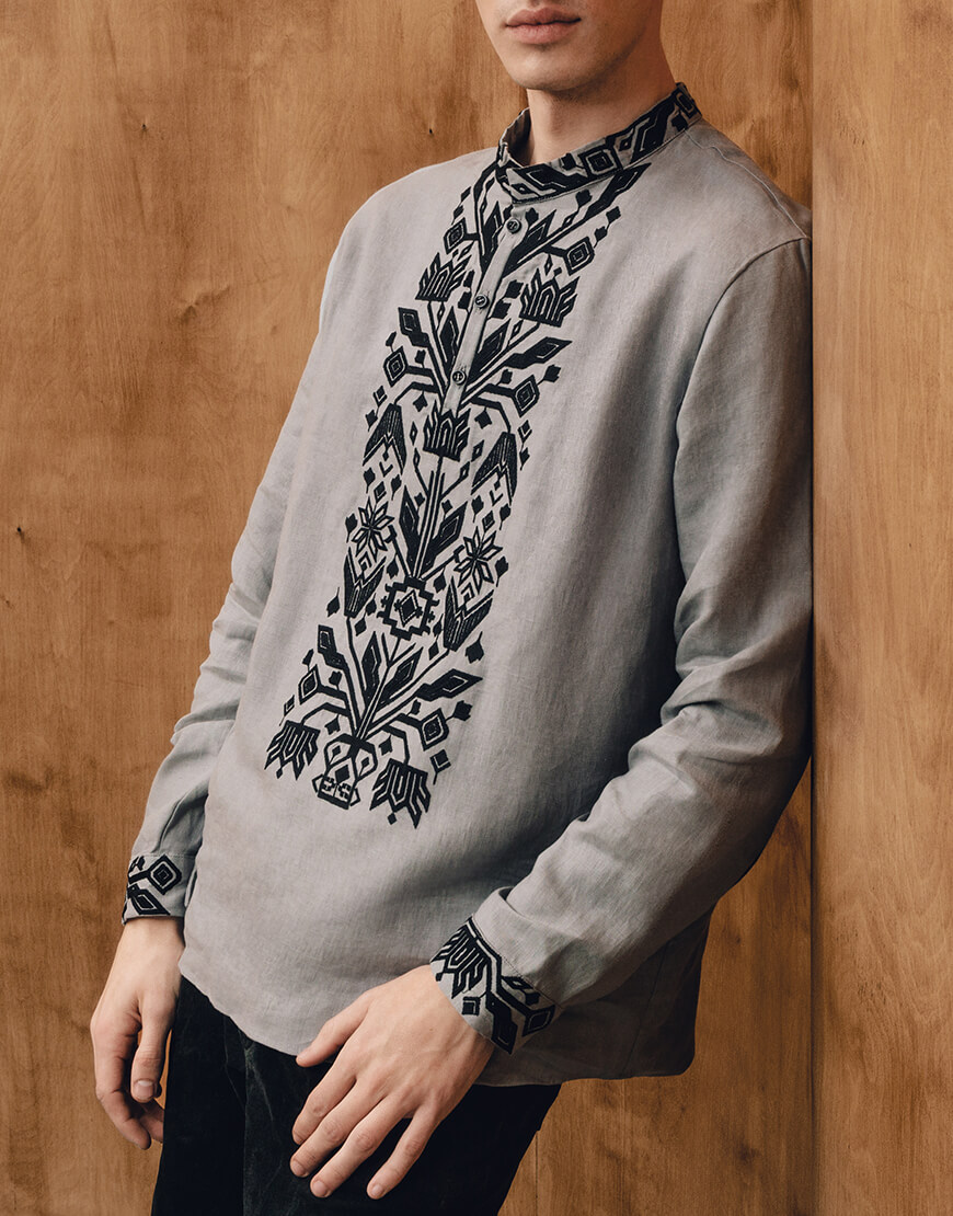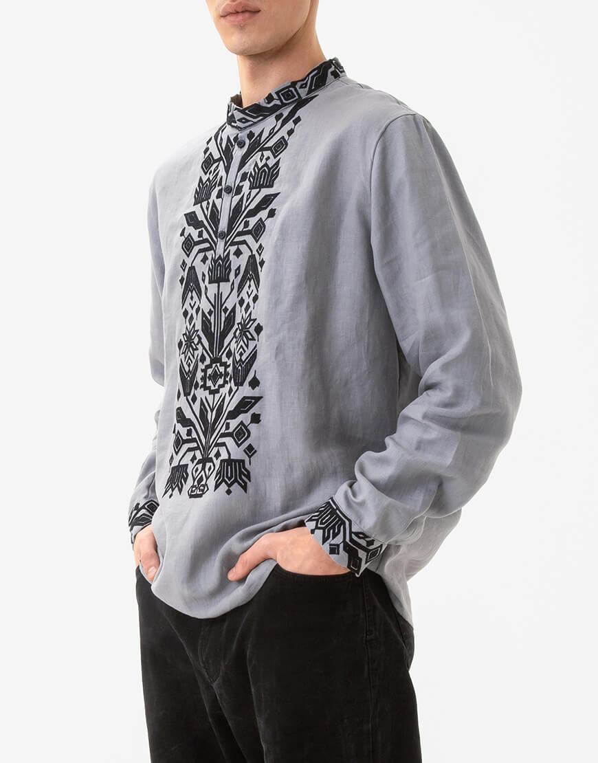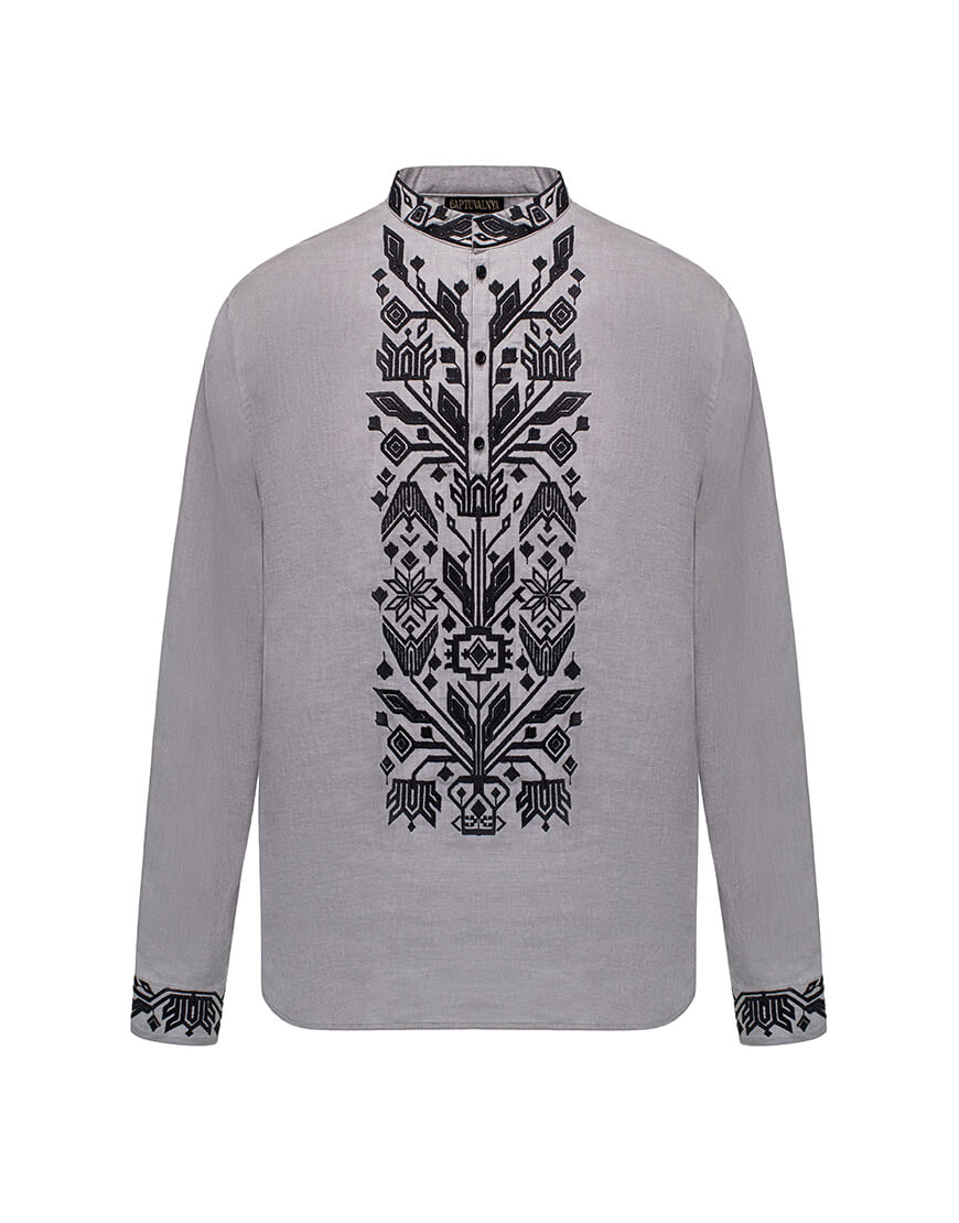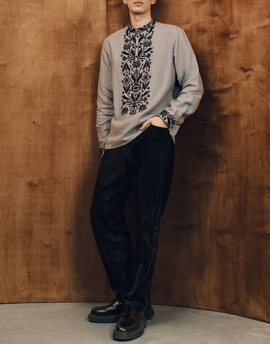 Чоловіча сорочка з традиційною вишивкою Килимок, чорний орнамент на сірому полотні
