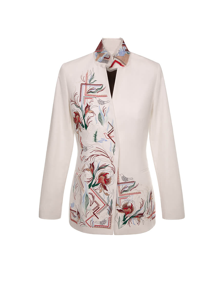 Доставка впродовж 5-7 робочих днівПіджак жіночий вільного крою з опущеною лінією плеча. Декор у вигляді вишивки зображає гірський хребет Карпат. Акцентом є квітка червої рути, яка щовесни розцвітає на високогір’ї. Доповнюють вишивку силует птаха, як символ свободи і відродження