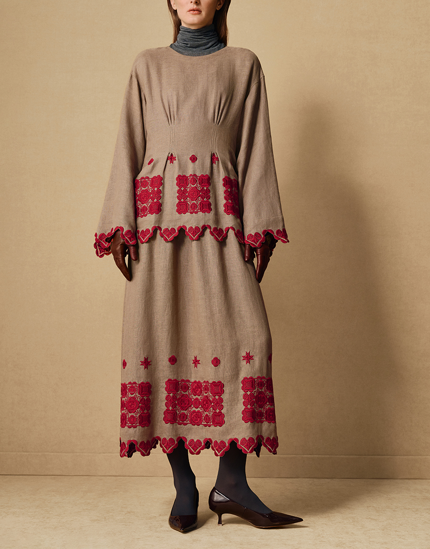 Доставка впродовж 2-5 робочих днівЛляна двошарова сукня з серцеподібними орнаментами хвилястими рядами на комірці, рукавах та подолі натхненні мотивами косівської кераміки.