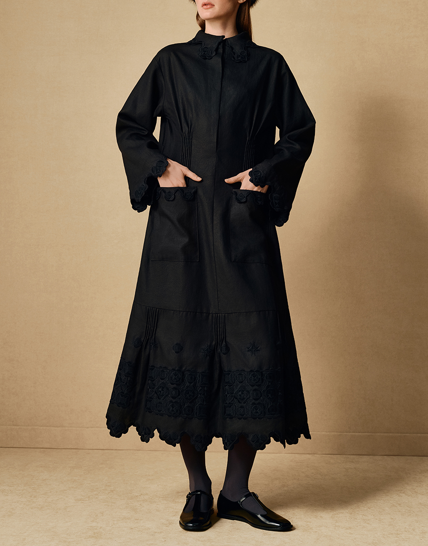 Доставка впродовж 2-5 робочих днівЛляна сукня напівприталеного силуету з монохромною вишивкою що відтворює орнаменти косівської кераміки