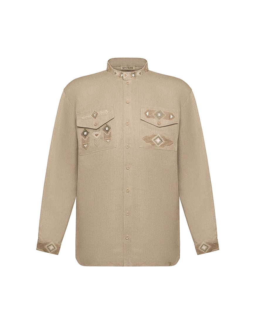 Доставка протягом 5-7 робочих днівЧоловіча сорочка з опущеною лінією плечей, оздоблена вишивкою на кишенях та на спині