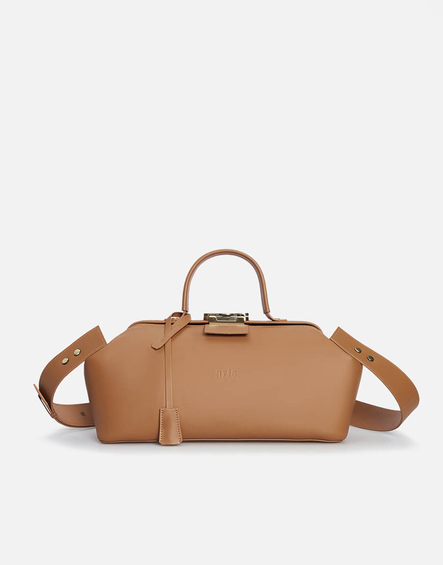 Жіноча шкіряна сумка-саквояж довгастої форми GRIE Baguette. Ця модель виконана з італійської шкіри коричневого кольору. Всередині червона текстильна підкладка, одна кишеня на блискавці та дві без блискавок. Фірмовий саквояжний замок закривається на ключик, забезпечуючи безпеку вмісту сумки у людних місцях. Чотири металеві ніжки на дні сумки захищають її від пошкоджень. Практичною особливістю саквояжів GRIE є їхня місткість. За рахунок структури рамкового замку, який приховує об’єм зовні, але залишає його всередині, у саквояж вміститься несподівано багато речей.