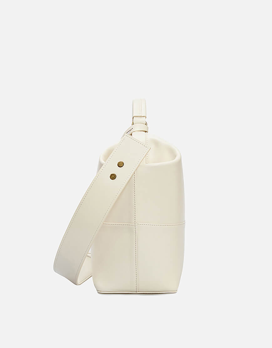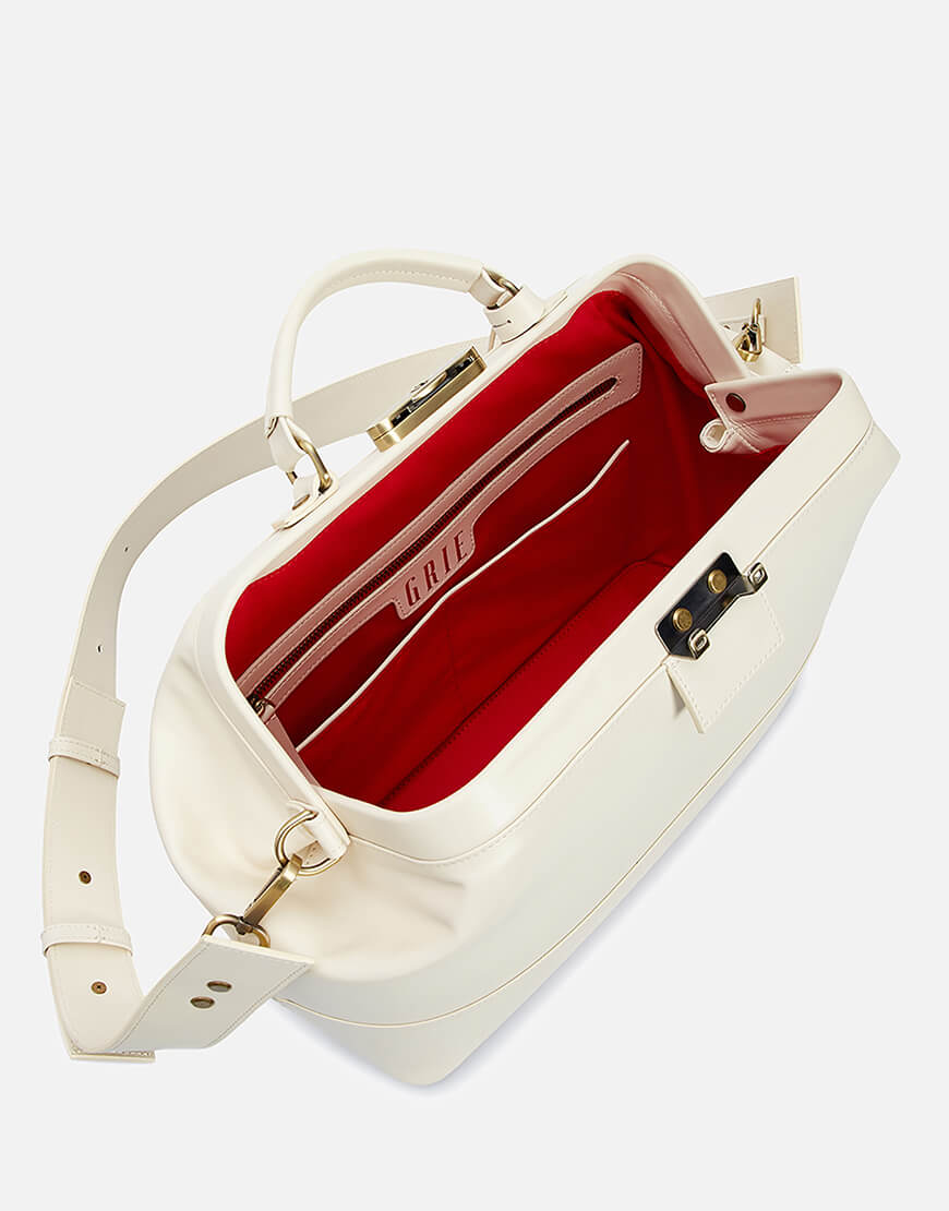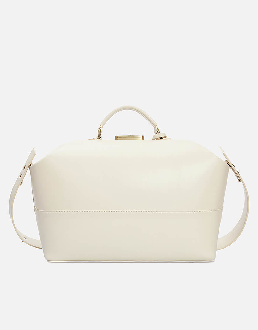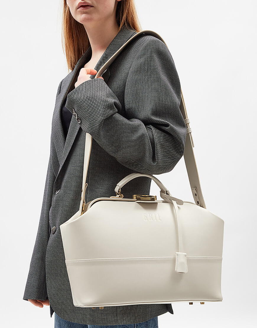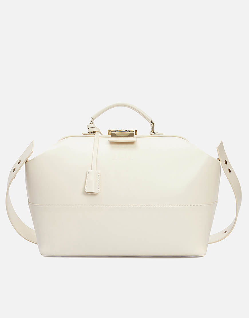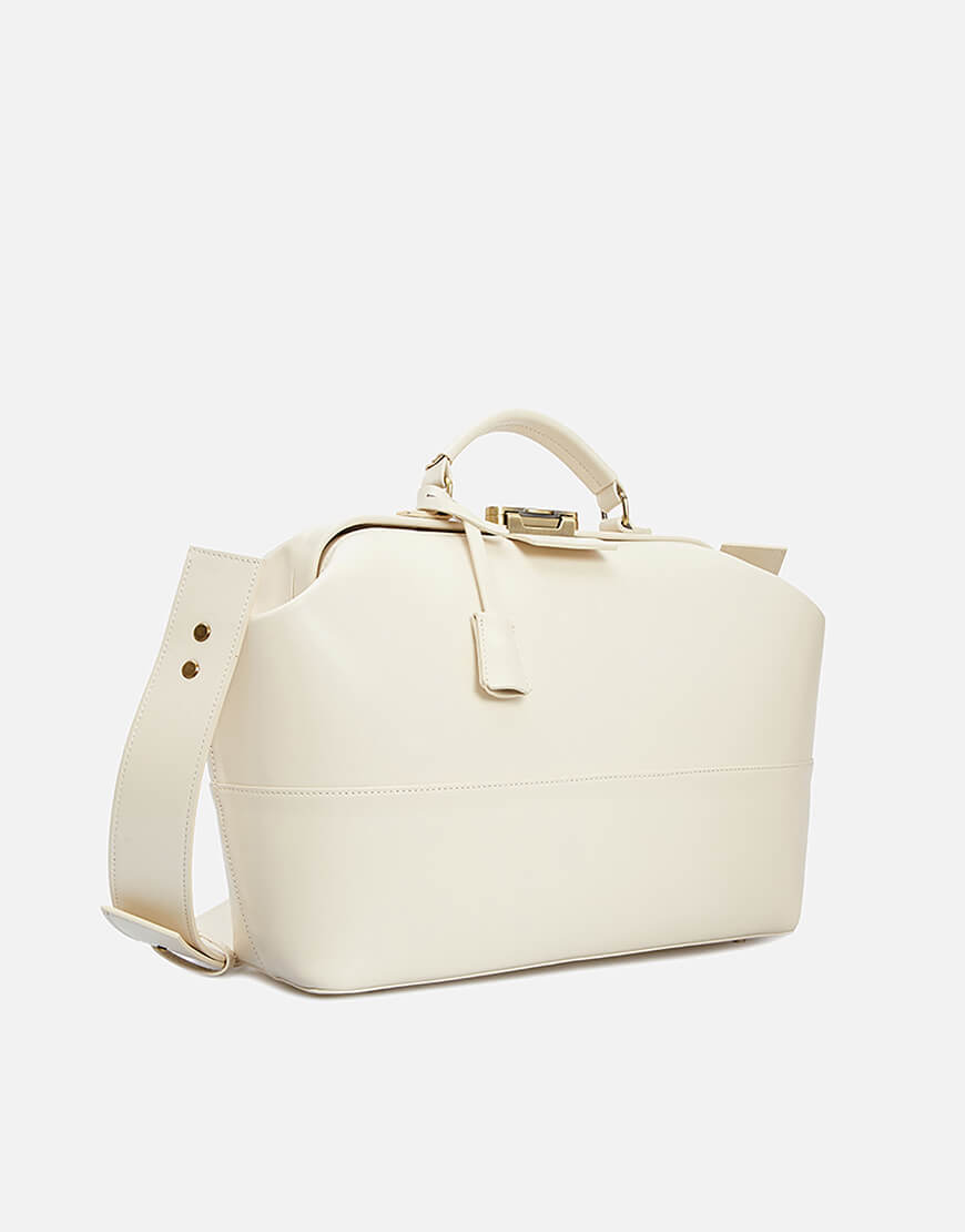 Ця надзвичайно містка сумка виготовлена з італійської шкіри кольору айворі. Модель зі знімним регульованим плечовим паском та маленькою ручкою. Має одне містке відділення, чотири плоскі кишені та дві кишені на блискавці. Лаконічний дизайн підкреслено тисненим логотипом. Закривається на ключ, що знаходиться в підвісці