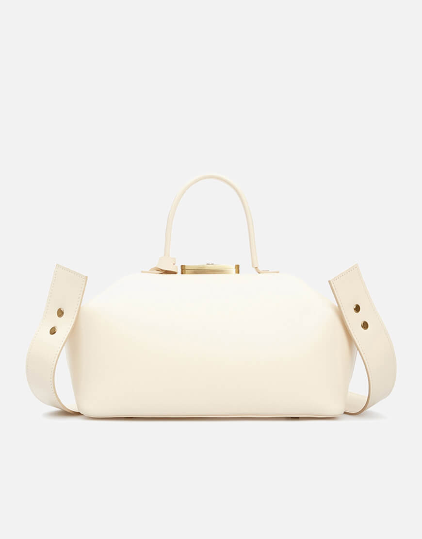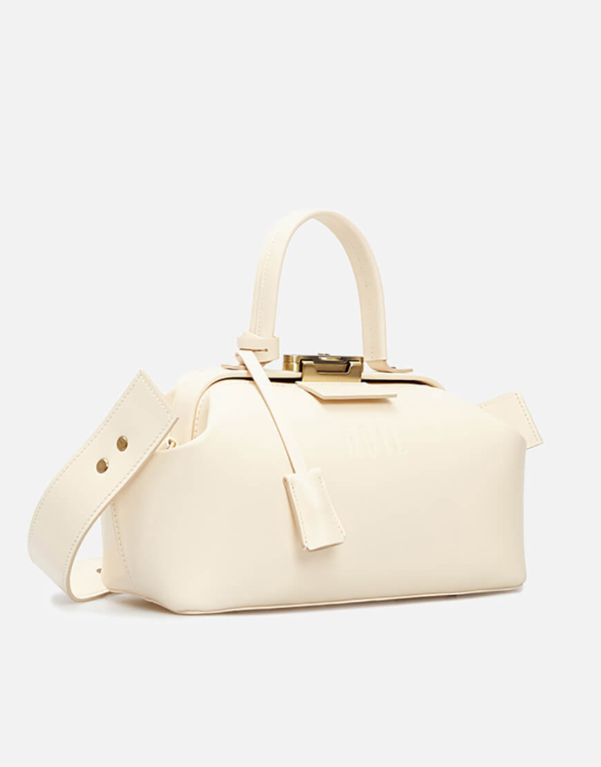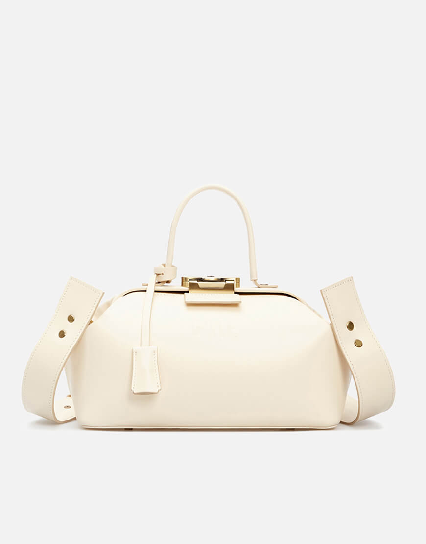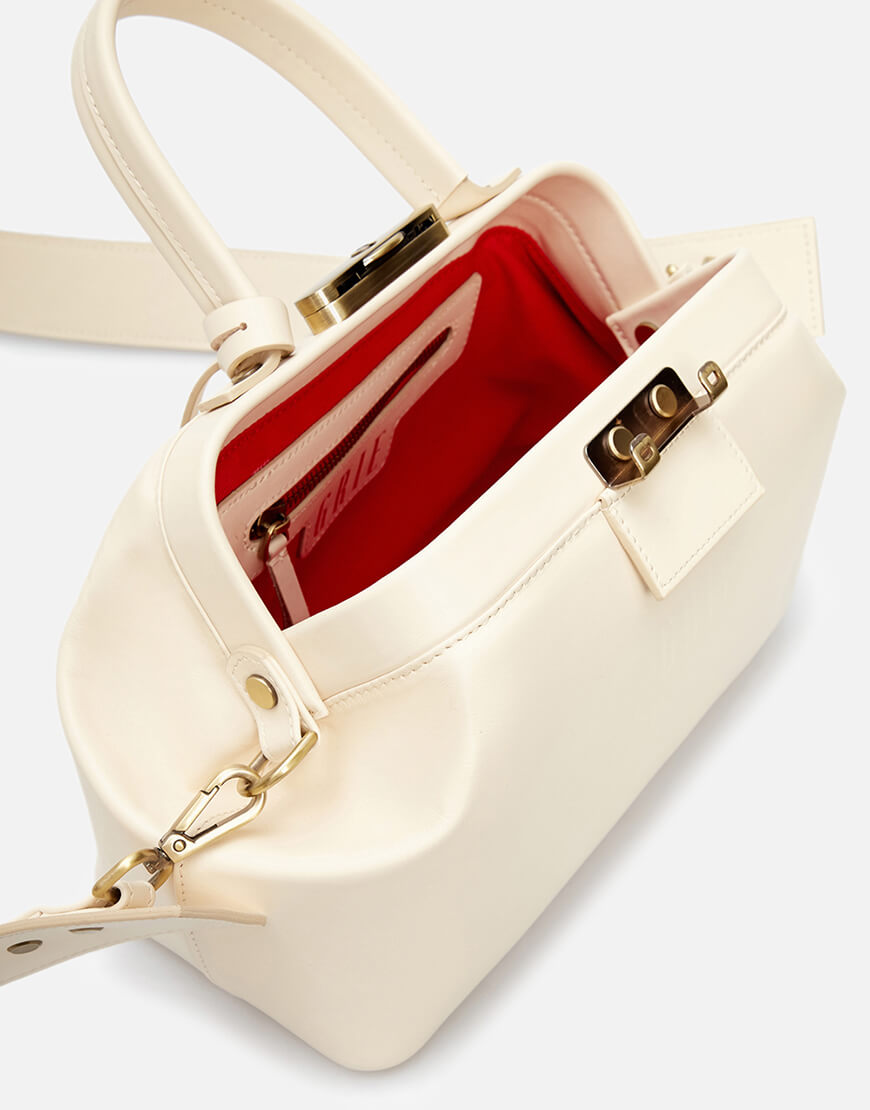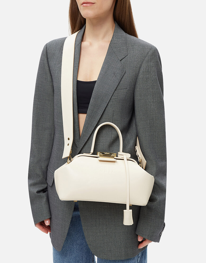Шкіряна сумка Noble кольору айворі. Компактна модель зі знімним регульованим плечовим паском та маленькою ручкою. Всередині має одне містке відділення, дві пласкі кишені та кишеню на блискавці. Стриманий і лаконічний дизайн підкреслено тисненим логотипом. Закривається на ключ, що знаходиться в підвісці